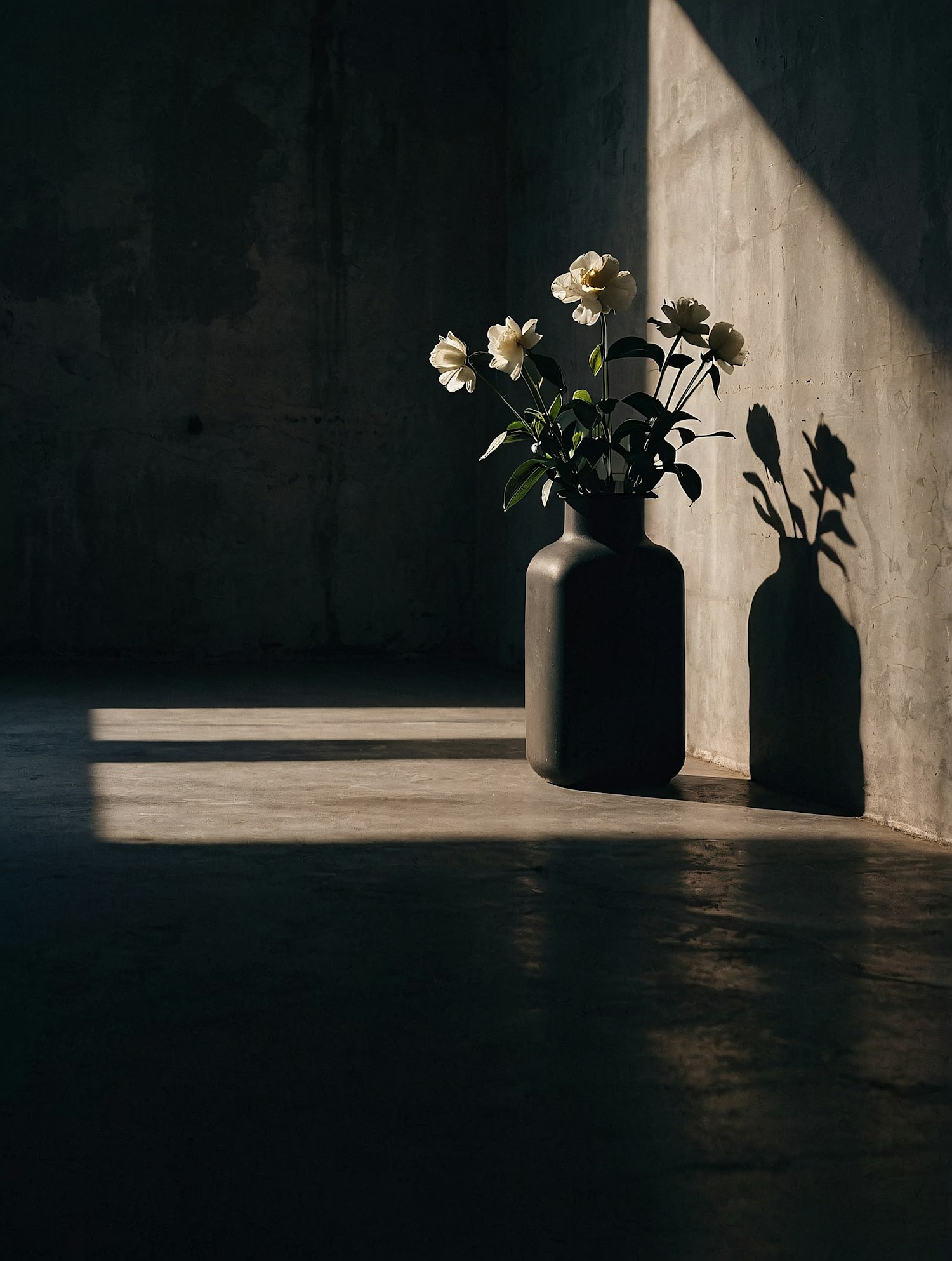 Minimalist vase with white flowers in soft sunlight, casting dramatic shadows on a textured concrete wall. Perfect for serene aesthetics.