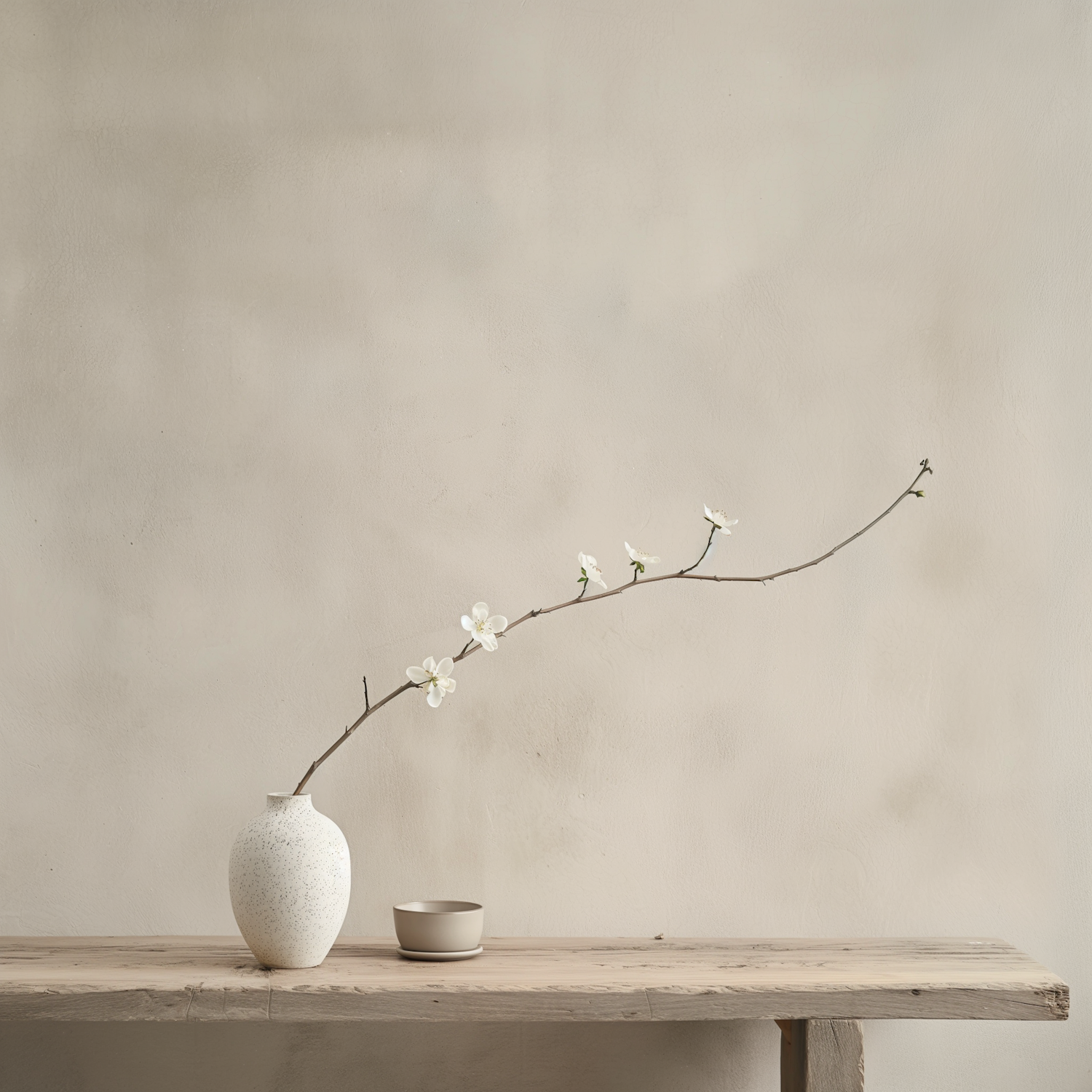 Minimalist decor with a white vase and blossoming branch on a rustic table against a beige wall, creating a serene and elegant scene.