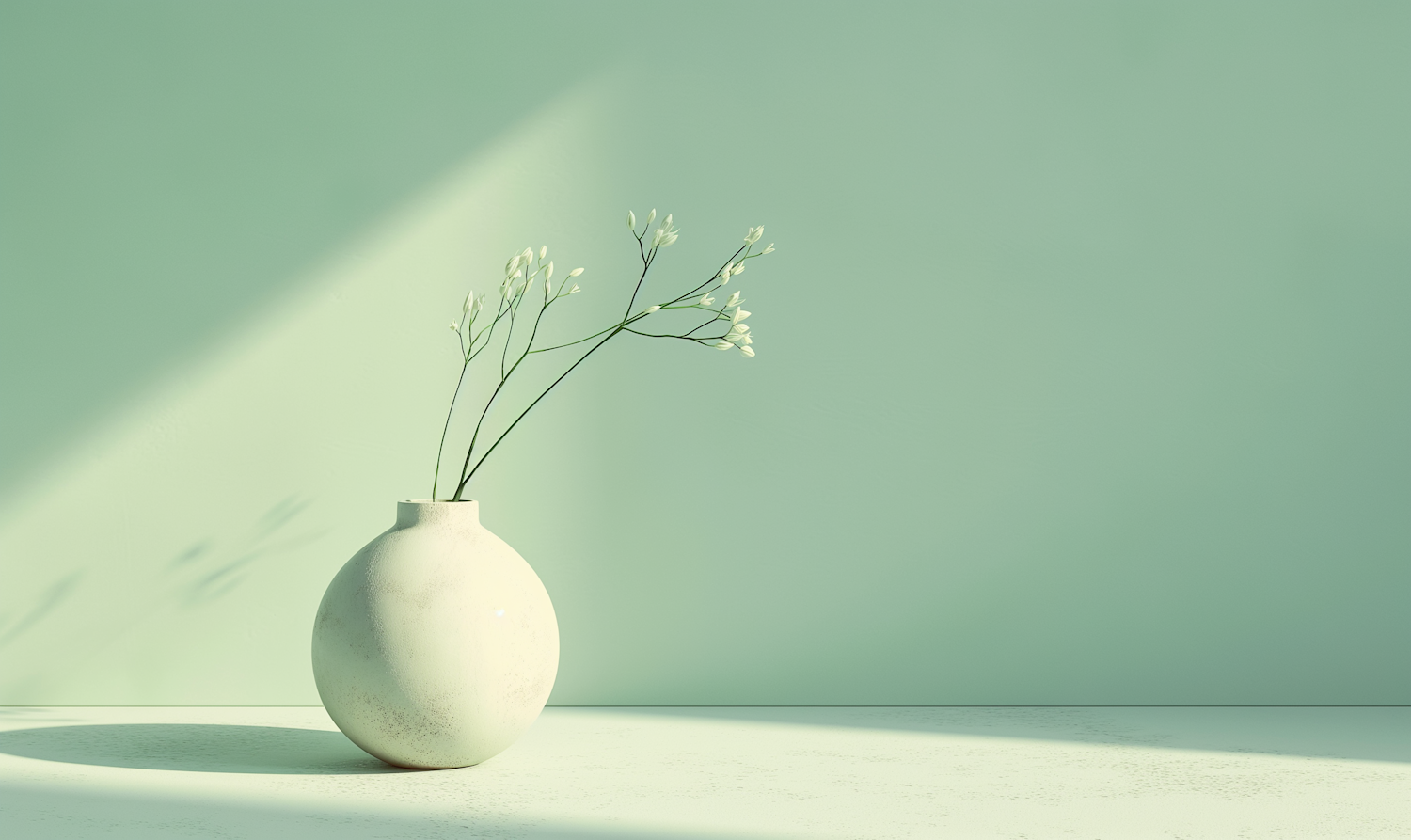 Minimalist white ceramic vase with delicate flowers on a light green surface, soft shadows, and a serene green background.