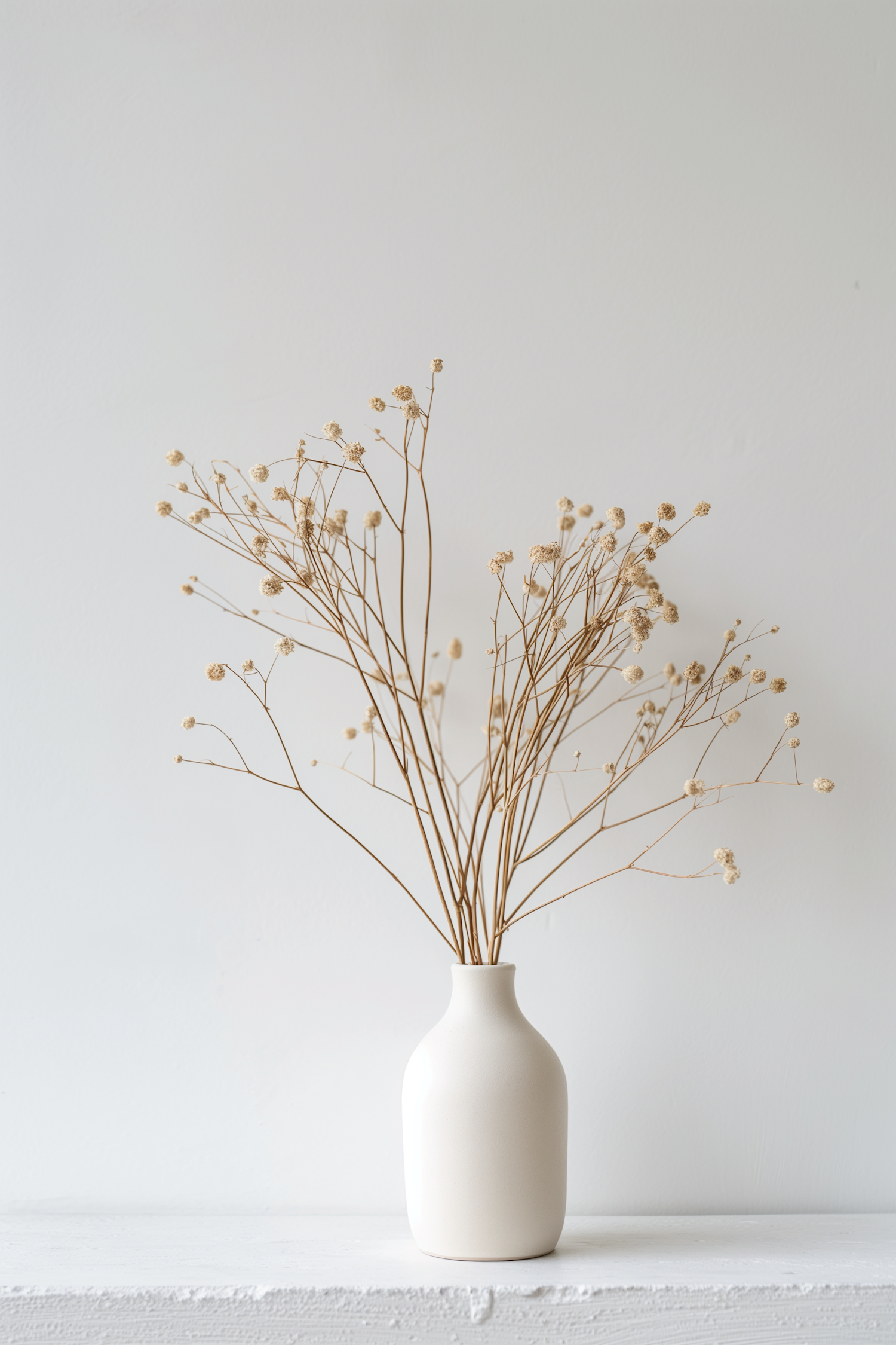 Minimalist white vase with dried flowers against a soft gray background, showcasing simplicity and elegance in neutral tones.