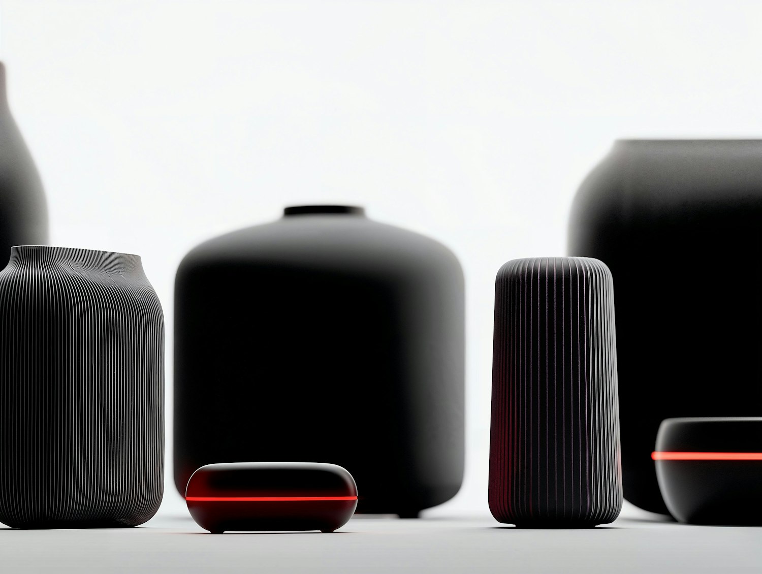 Sleek black vases with vertical grooves and glowing red accents on a minimalist background, exuding modern elegance.