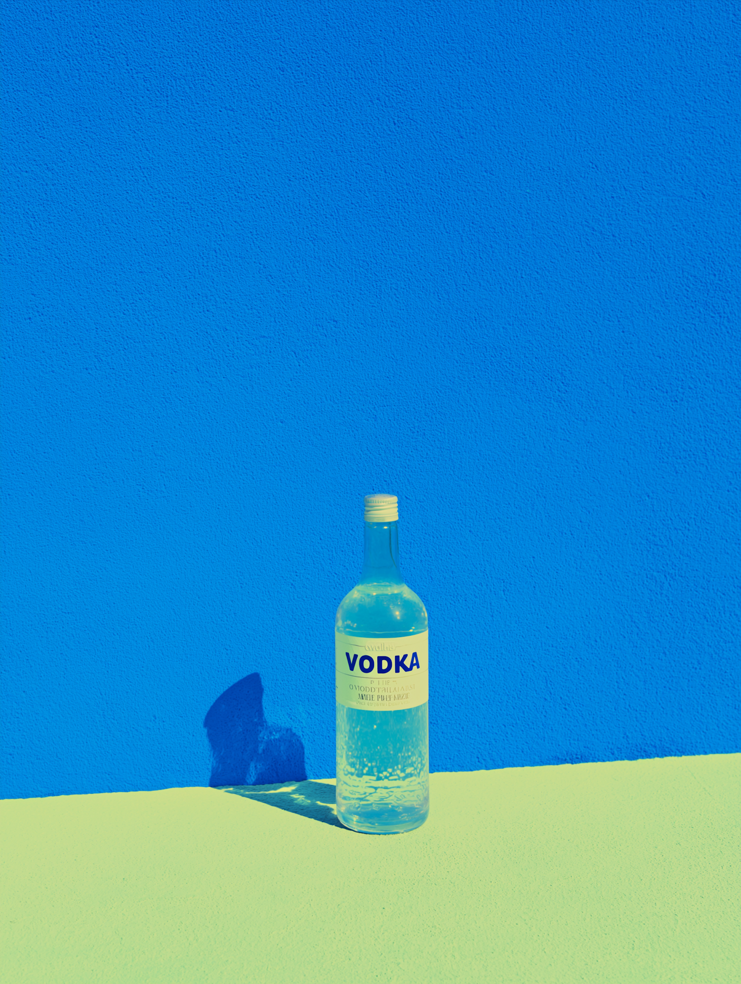 Minimalist photo of a vodka bottle against a vibrant blue wall and light green surface, creating a striking color contrast.