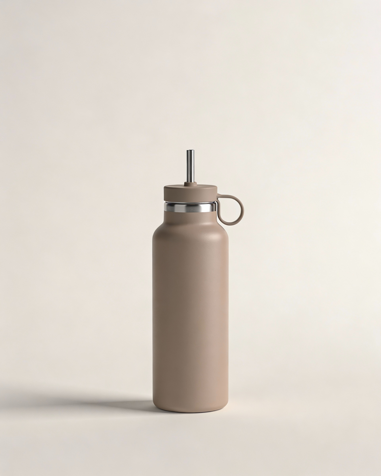 A premium stainless steel water bottle with a built-in straw lid and a small carry handle, neutral matte color (warm beige / taupe), minimal modern design, no logo, no text, clean studio packshot on a soft off-white background, realistic soft shadow, high-end product photography, quiet luxury aesthetic, sharp focus, ultra realistic, 4k