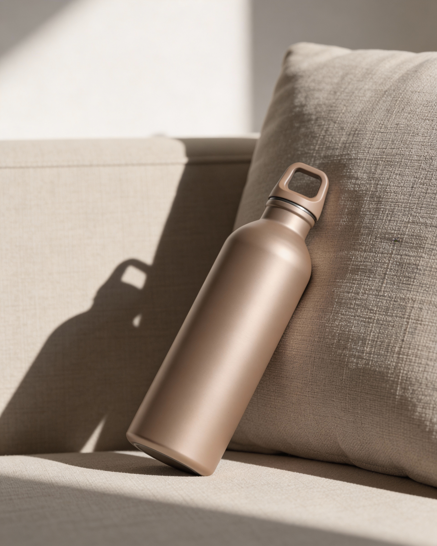 A minimalist beige water bottle on a textured cushion, bathed in soft sunlight, showcasing modern design and neutral tones.