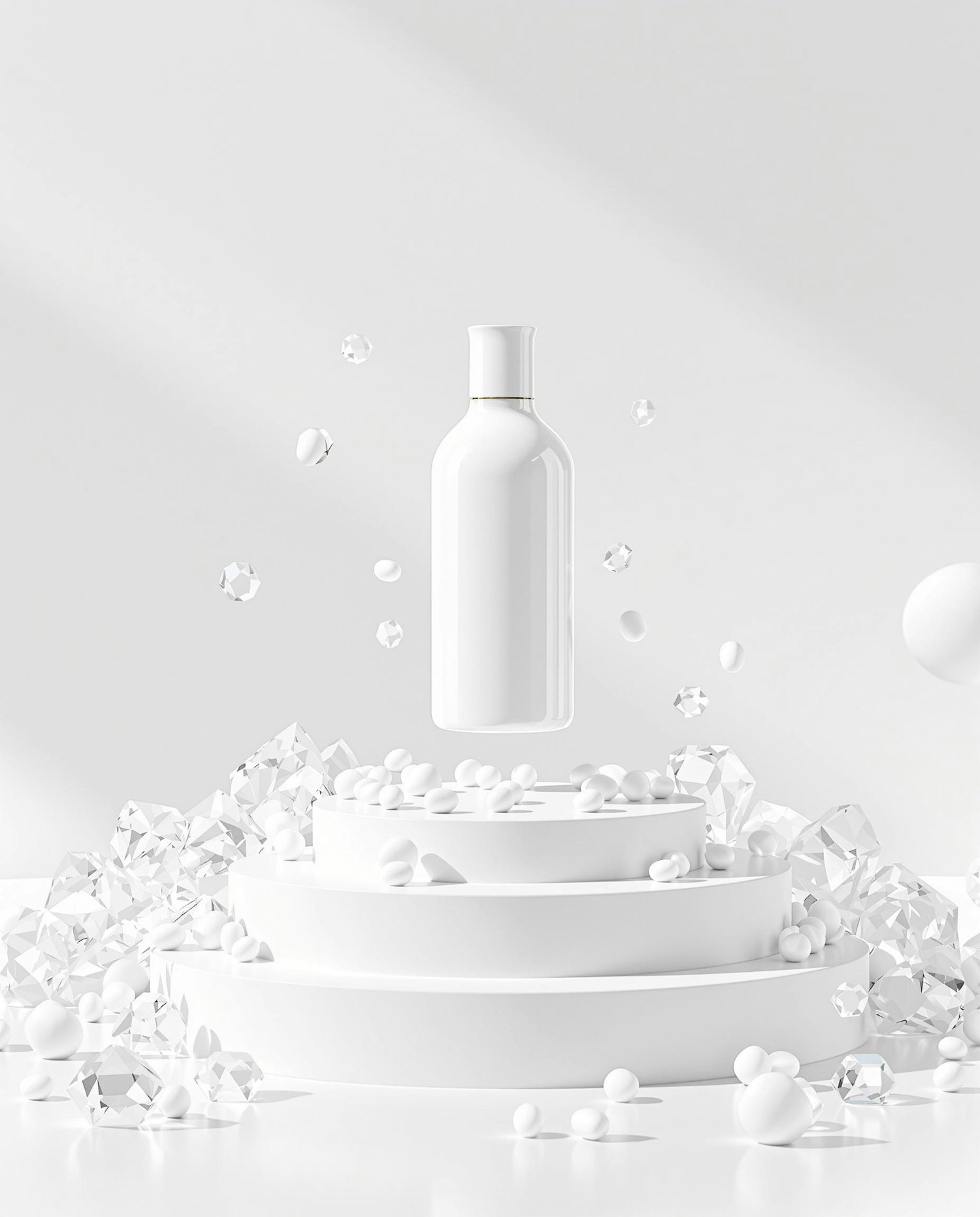 Floating white ceramic bottle above layered white platforms, surrounded by clear ice-like crystals and soft white jelly beans, high-key lighting on a white-on-white background, clean and futuristic look with elegant shadows