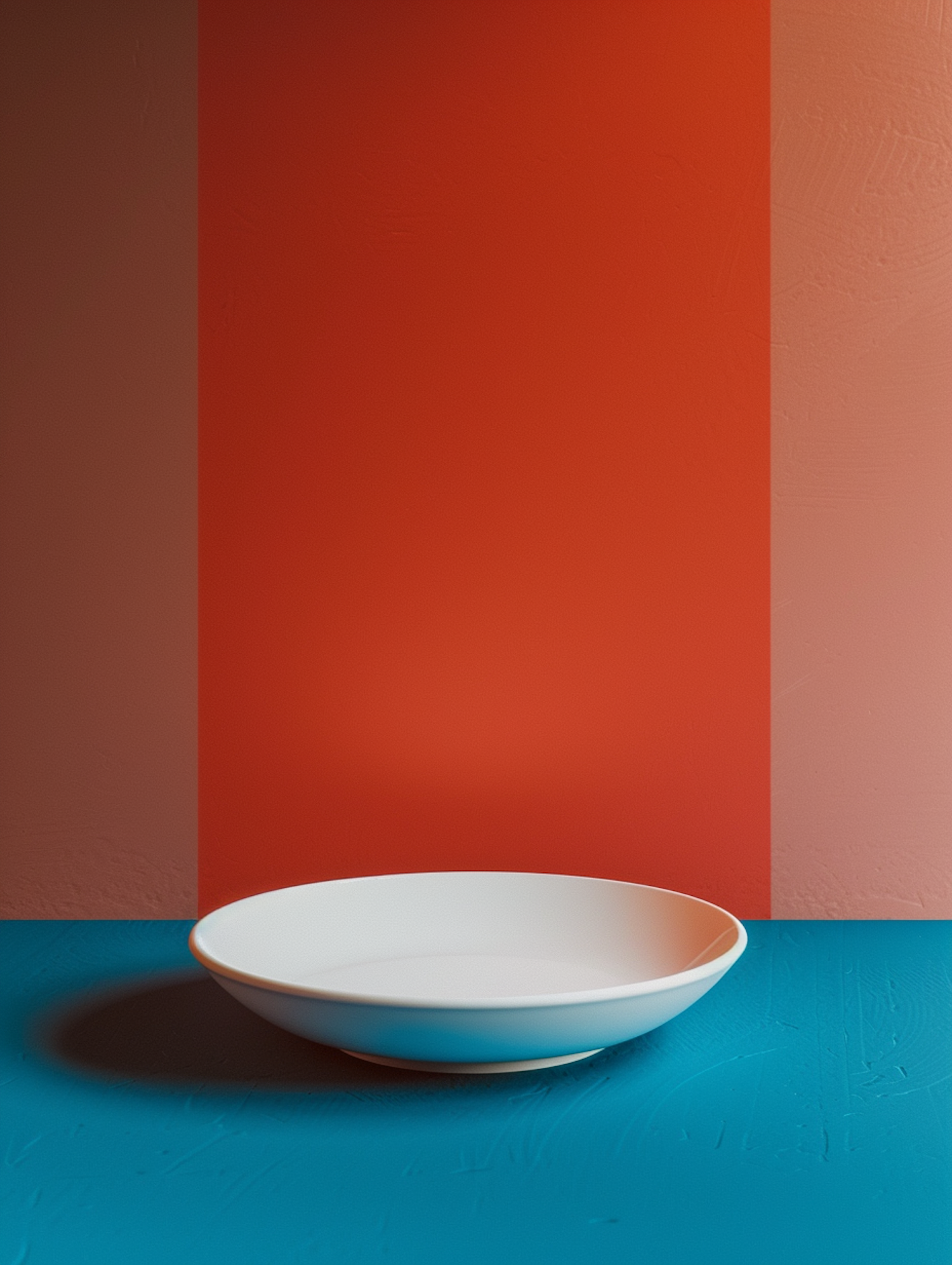 Minimalist scene with a white bowl on a blue surface, set against a colorful background of brown, orange, and pink vertical stripes.