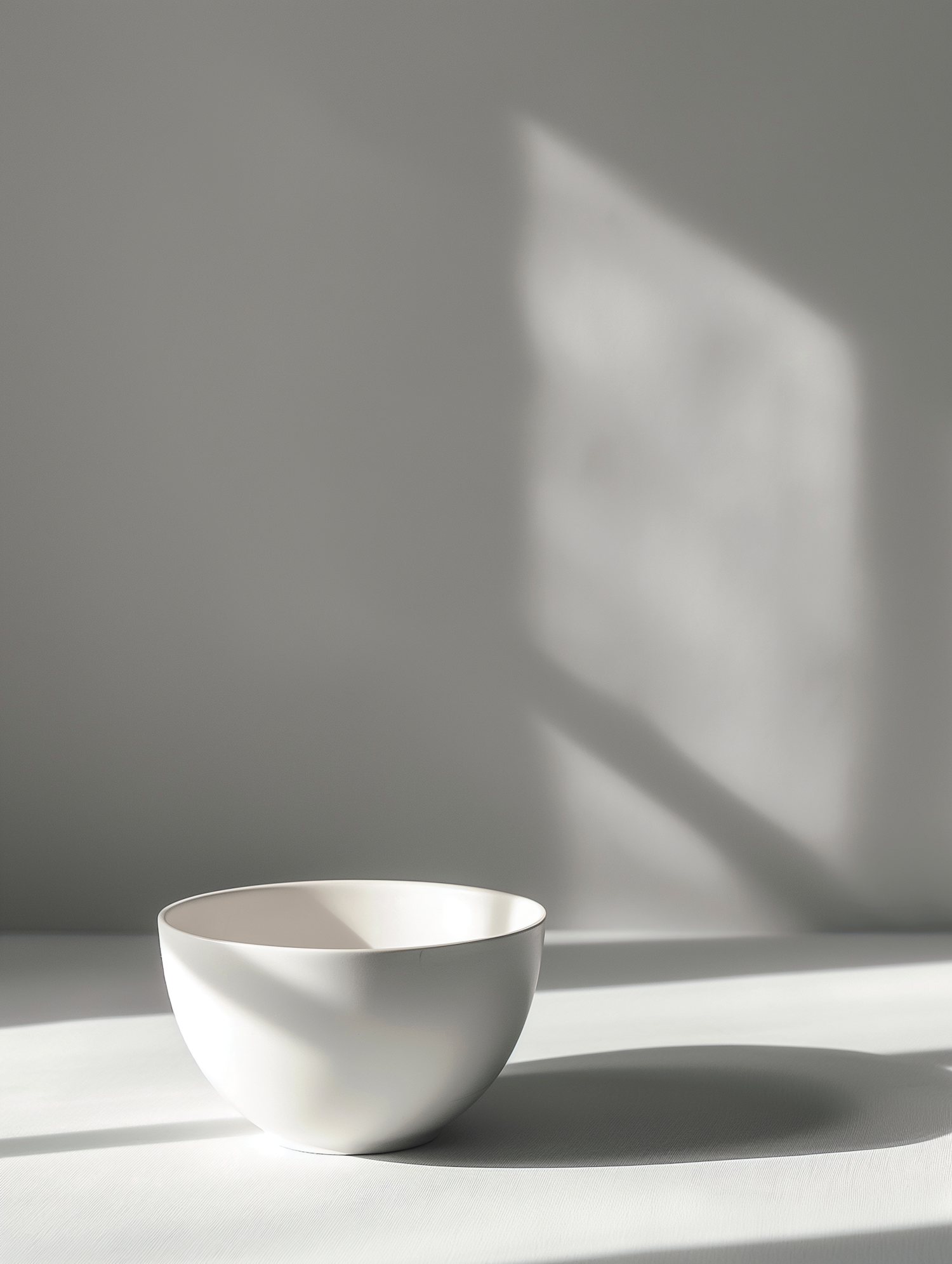 Minimalist white ceramic bowl on a light surface with soft shadows and sunlight, creating a serene and balanced composition.