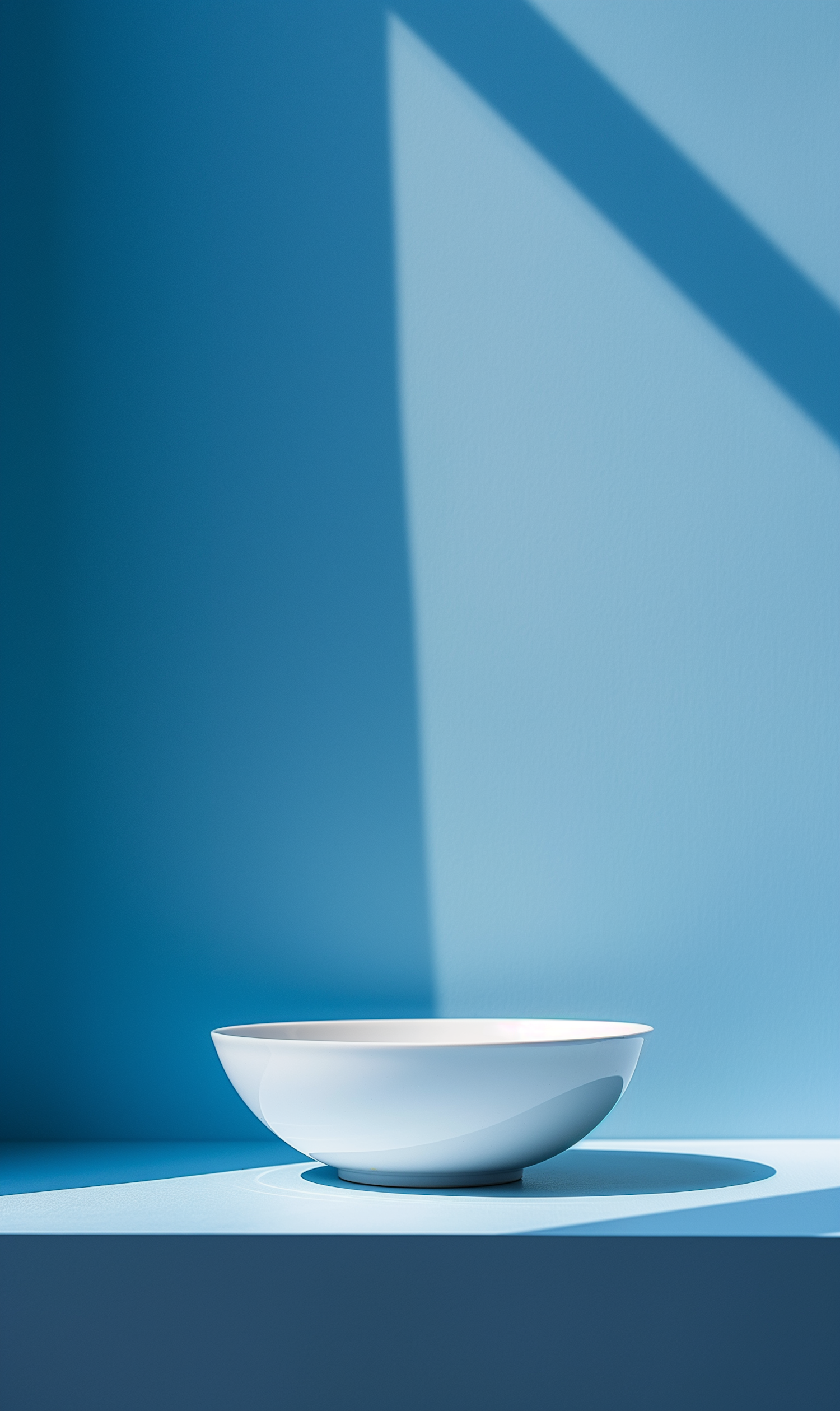 Minimalist white bowl on a blue surface with dramatic shadow play, creating a serene and elegant composition.