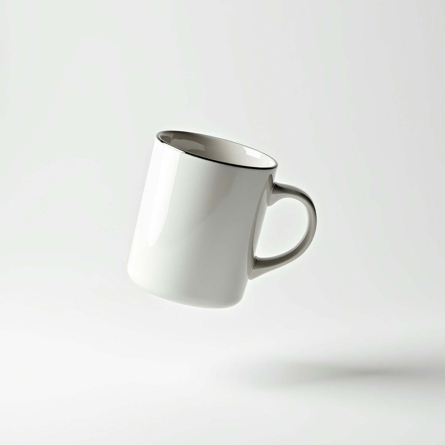 A white ceramic mug with a black rim floats against a light gray background, creating a minimalist and surreal visual effect.