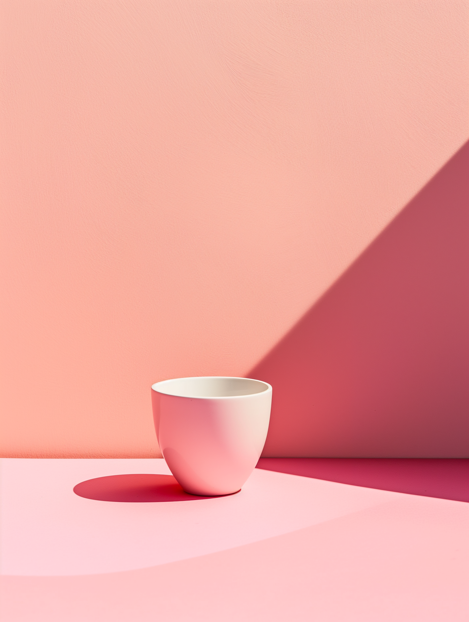 Minimalist white cup on a pink surface with dramatic shadows, creating a serene and elegant composition.