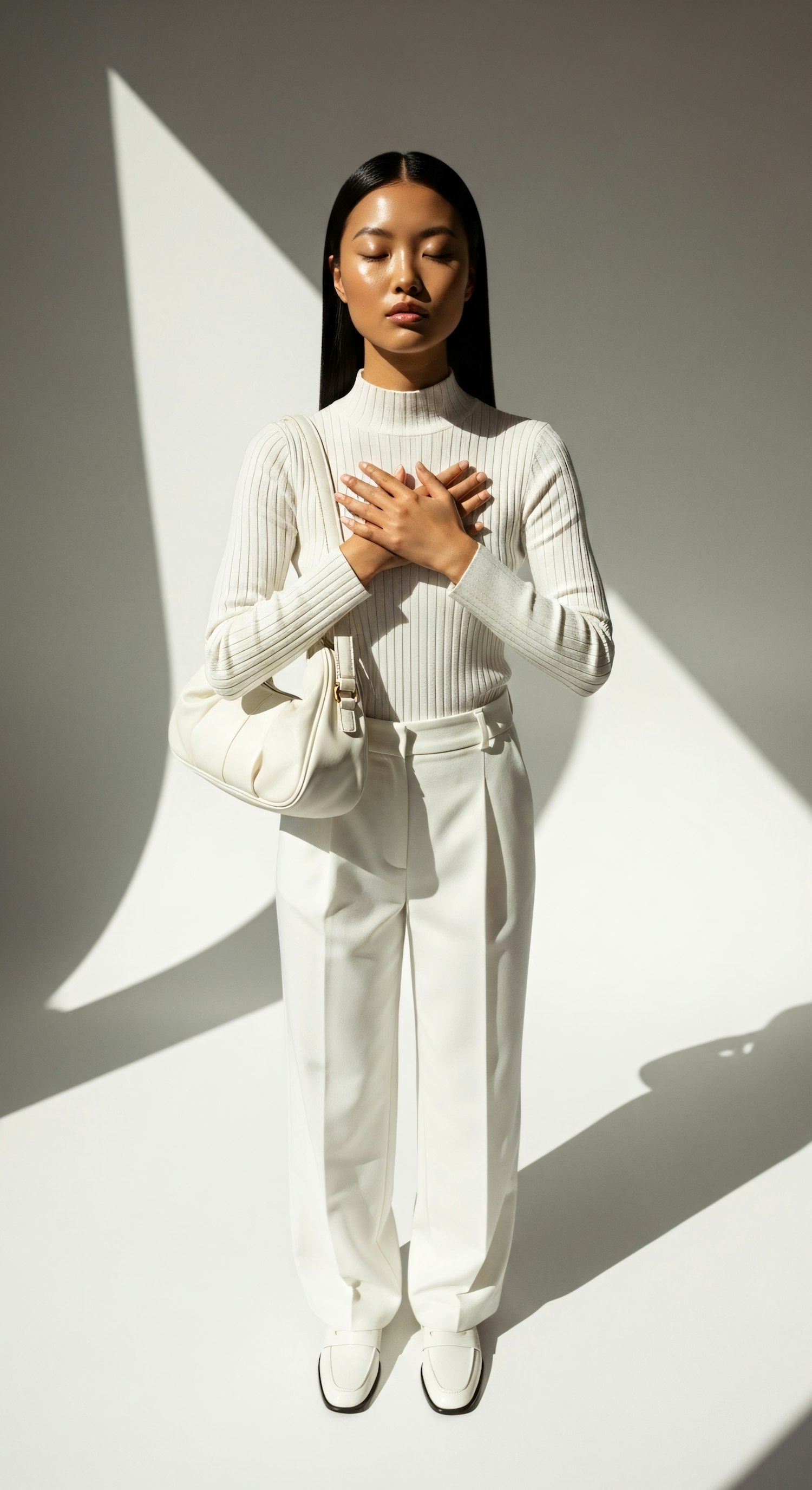 A serene woman in a white outfit stands with hands on her chest, exuding calmness. The minimalist setting highlights her elegance.