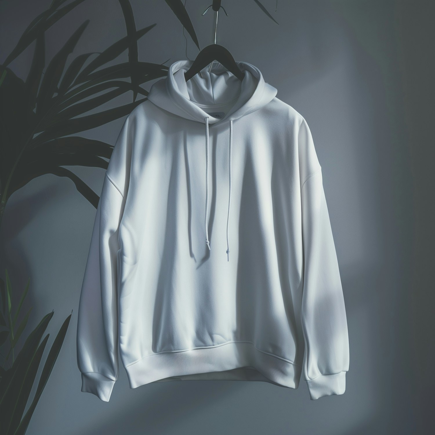 Minimalist white hoodie on a black hanger, set against a muted gray background with soft lighting and green leaves adding a natural touch.
