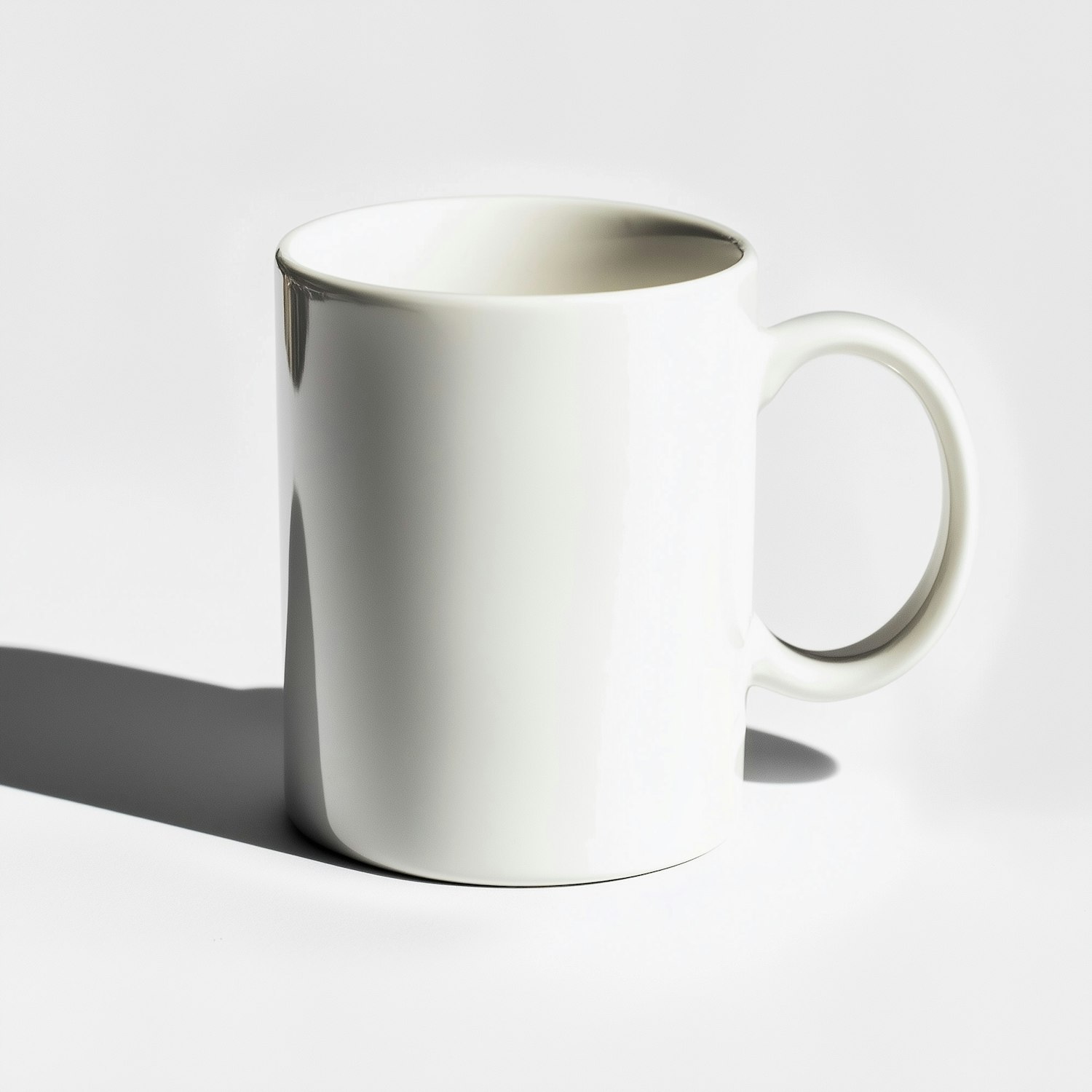 Minimalist white ceramic mug with a glossy finish, perfect for coffee or tea, set against a clean white background.