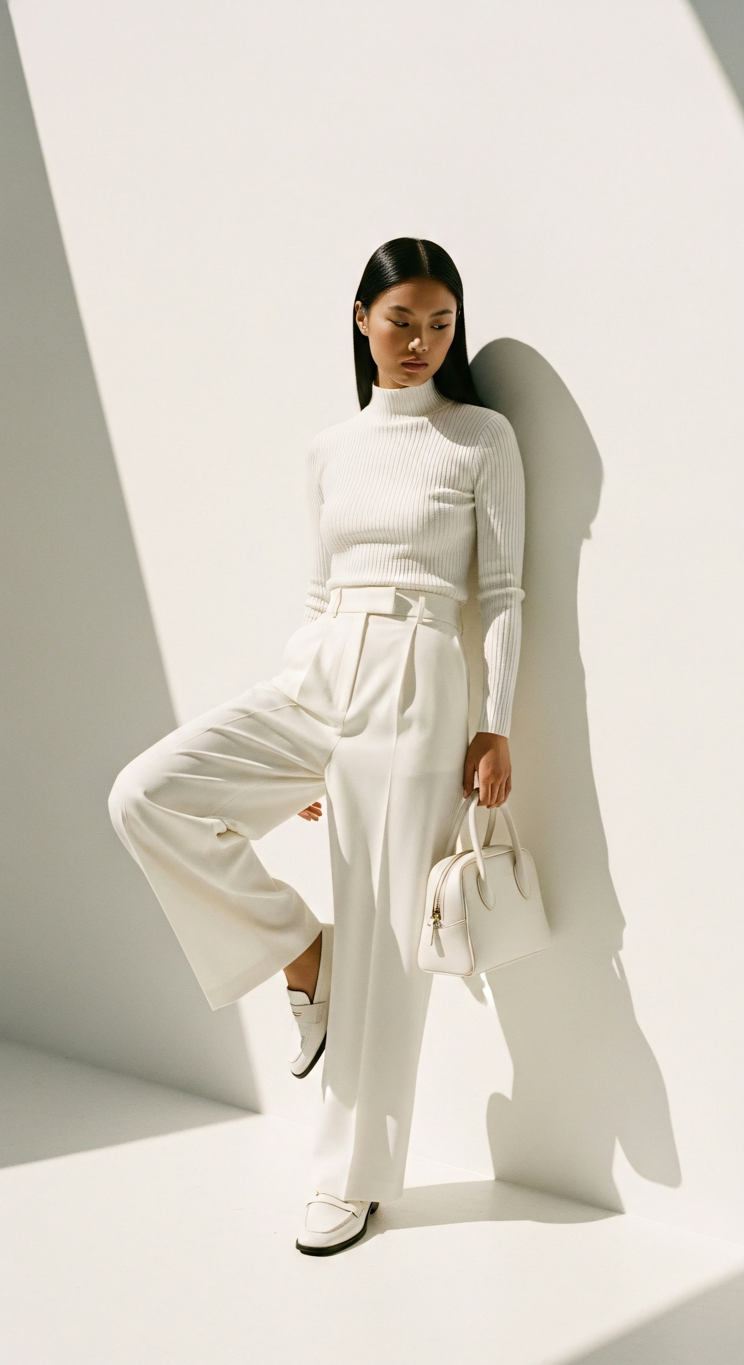 A stylish woman in an all-white outfit poses against a white wall, showcasing minimalist fashion with a serene and modern vibe.