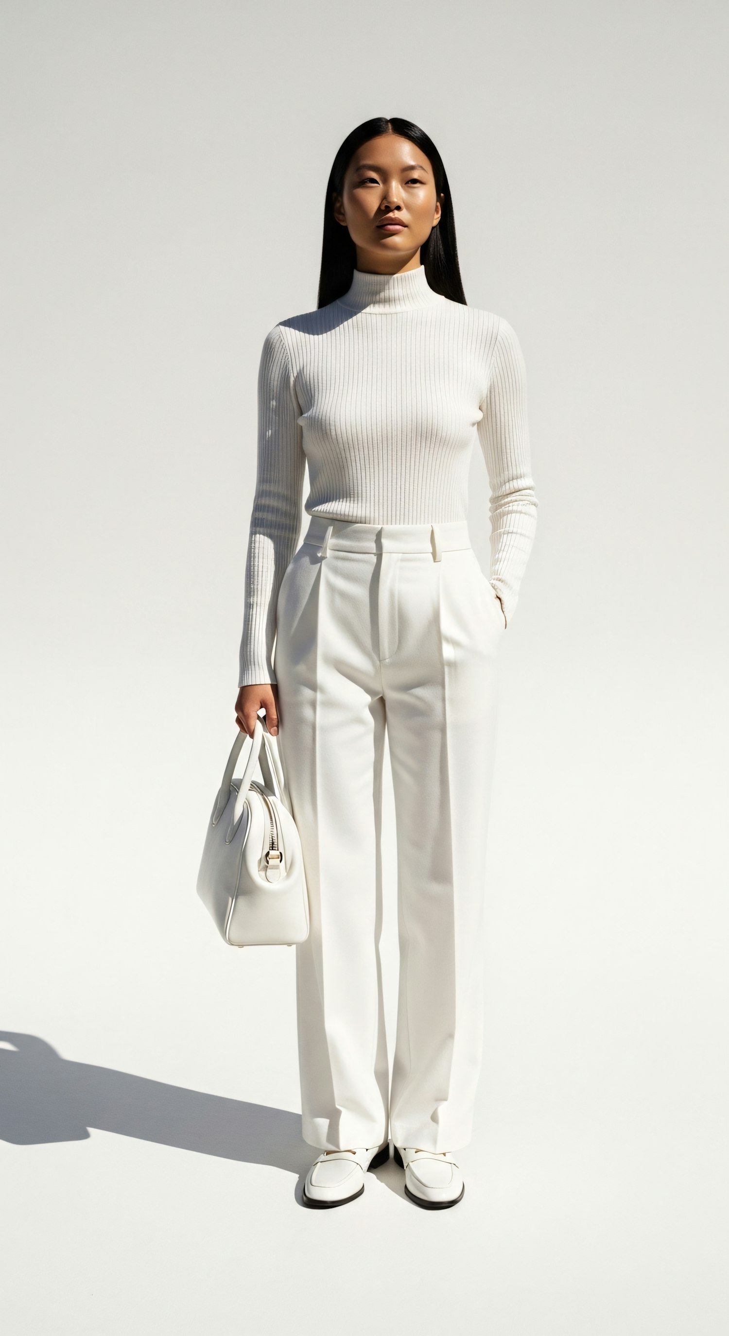 A person in a stylish white outfit with a turtleneck, trousers, and a handbag, standing against a plain background with soft lighting.
