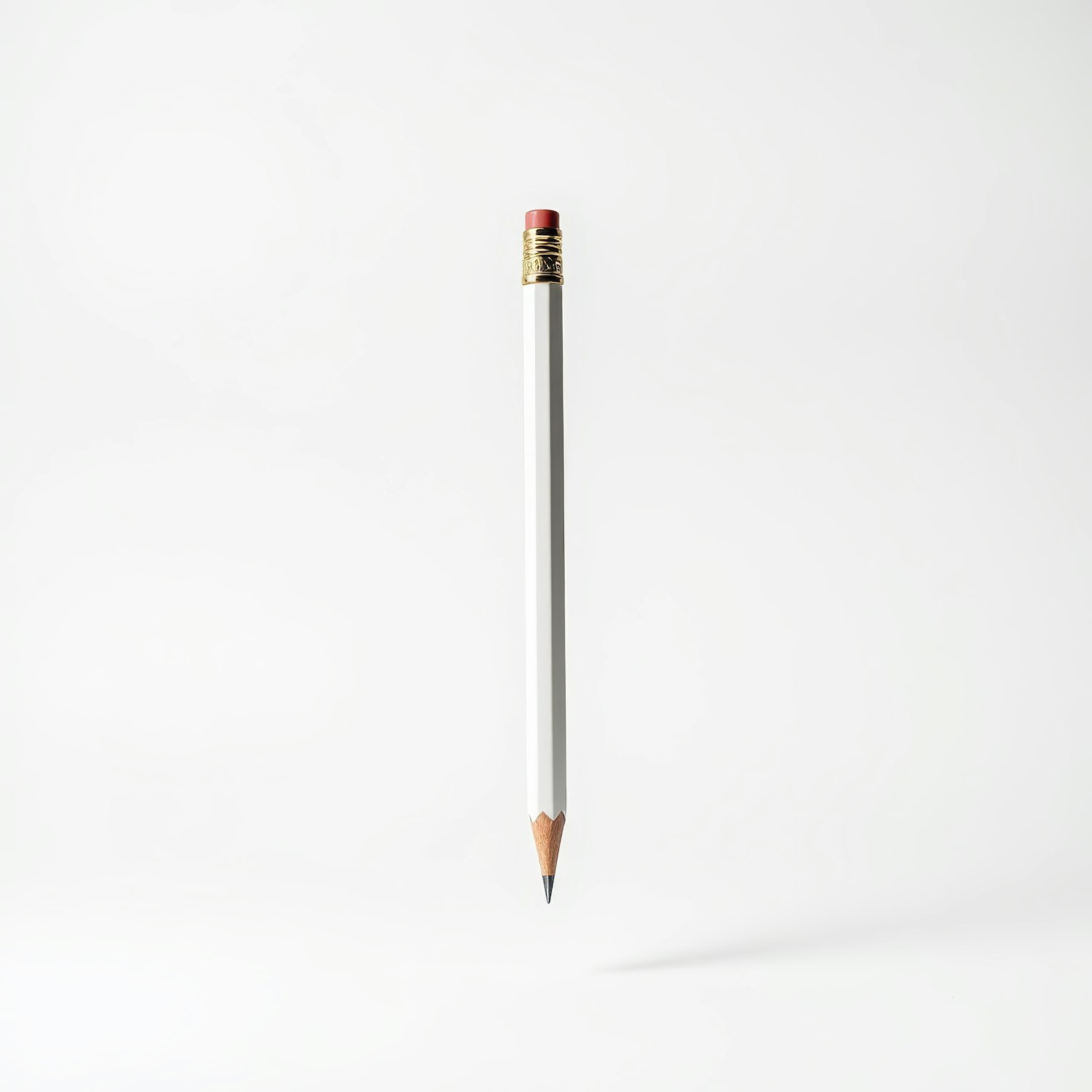 Minimalist image of a white pencil with a pink eraser and golden ferrule, floating against a white background.