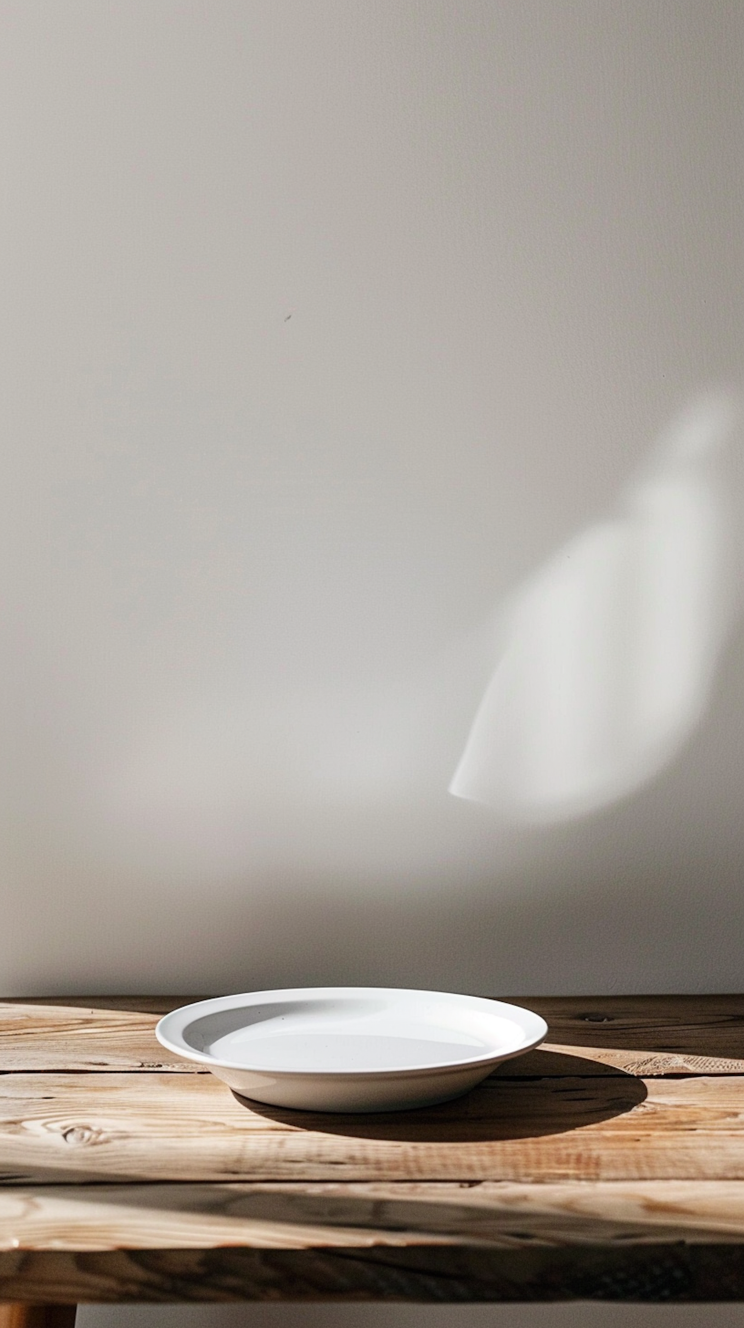 Minimalist scene with a white plate on a rustic wooden table, bathed in soft natural light against a plain wall.