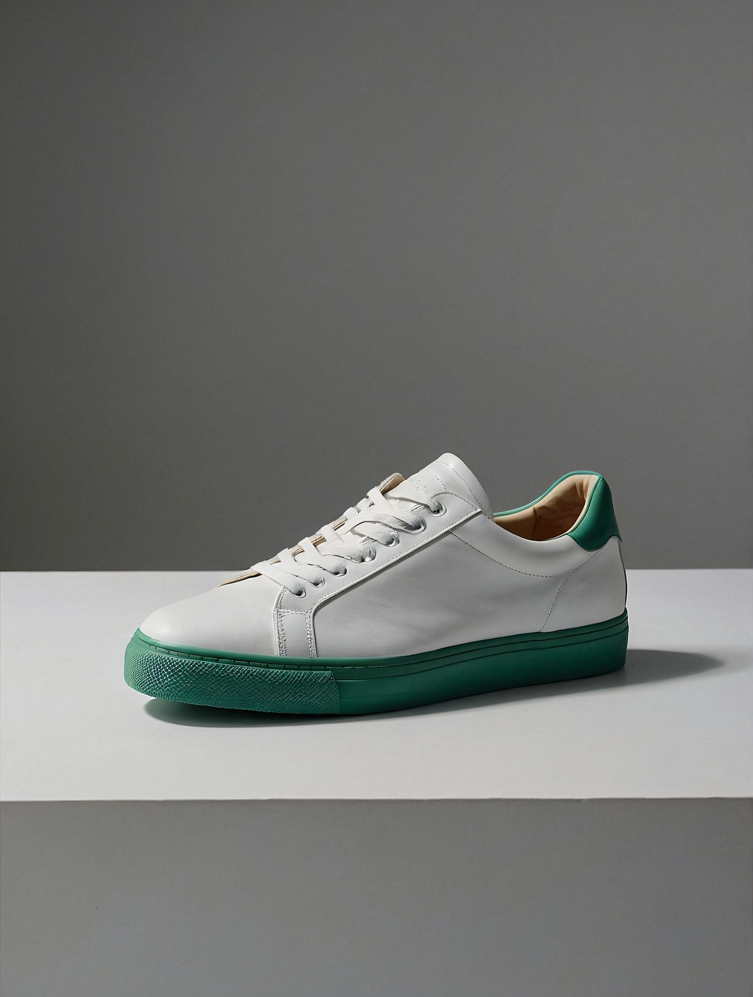 Minimalist white leather sneaker with a vibrant green sole and heel accent, perfect for casual or stylish outfits.