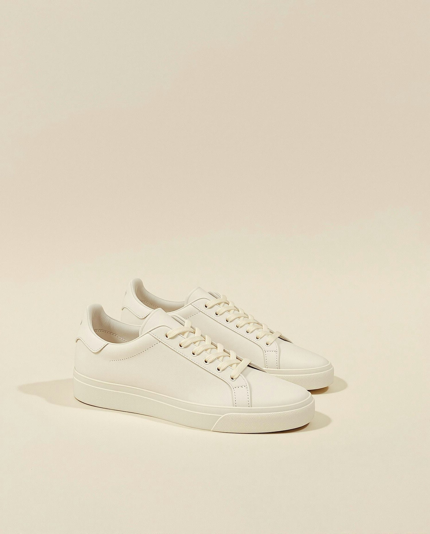 Minimalist white sneakers with smooth leather uppers and tonal laces, set against a neutral beige background for a clean, modern look.