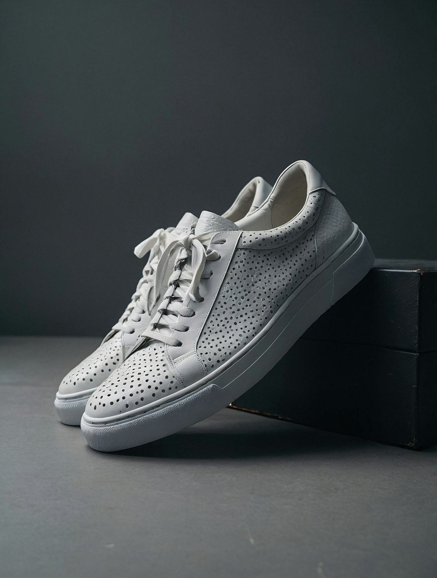 Minimalist white sneakers with perforated leather design, thick soles, and clean lines, set against a dark background for a modern look.