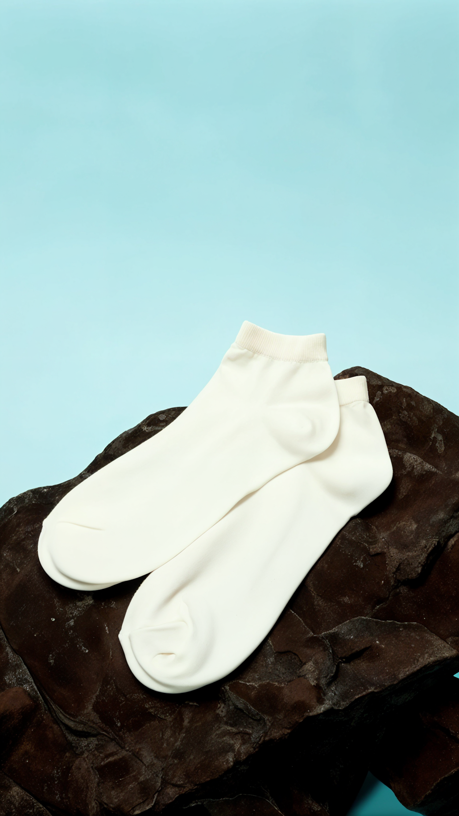 White ankle socks on a textured rock with a light blue background, creating a minimalist and contrasting visual composition.