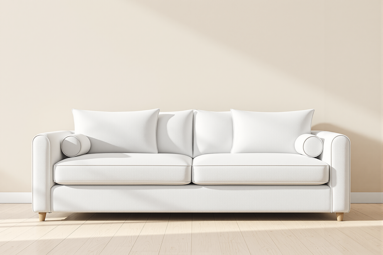 A sleek white sofa with clean lines and wooden legs, set against a beige wall and light wood flooring, perfect for modern interiors.