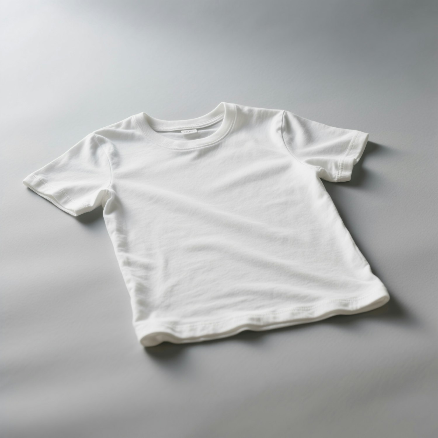 Minimalist white t-shirt on a light gray background, showcasing its clean design and soft fabric texture.