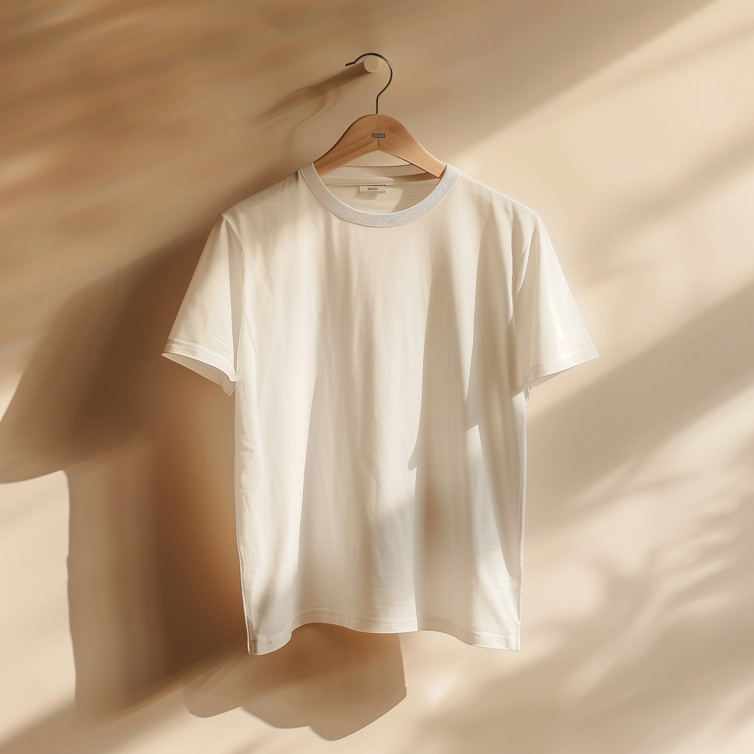 Minimalist white T-shirt on a wooden hanger against a beige wall with soft lighting and shadows.