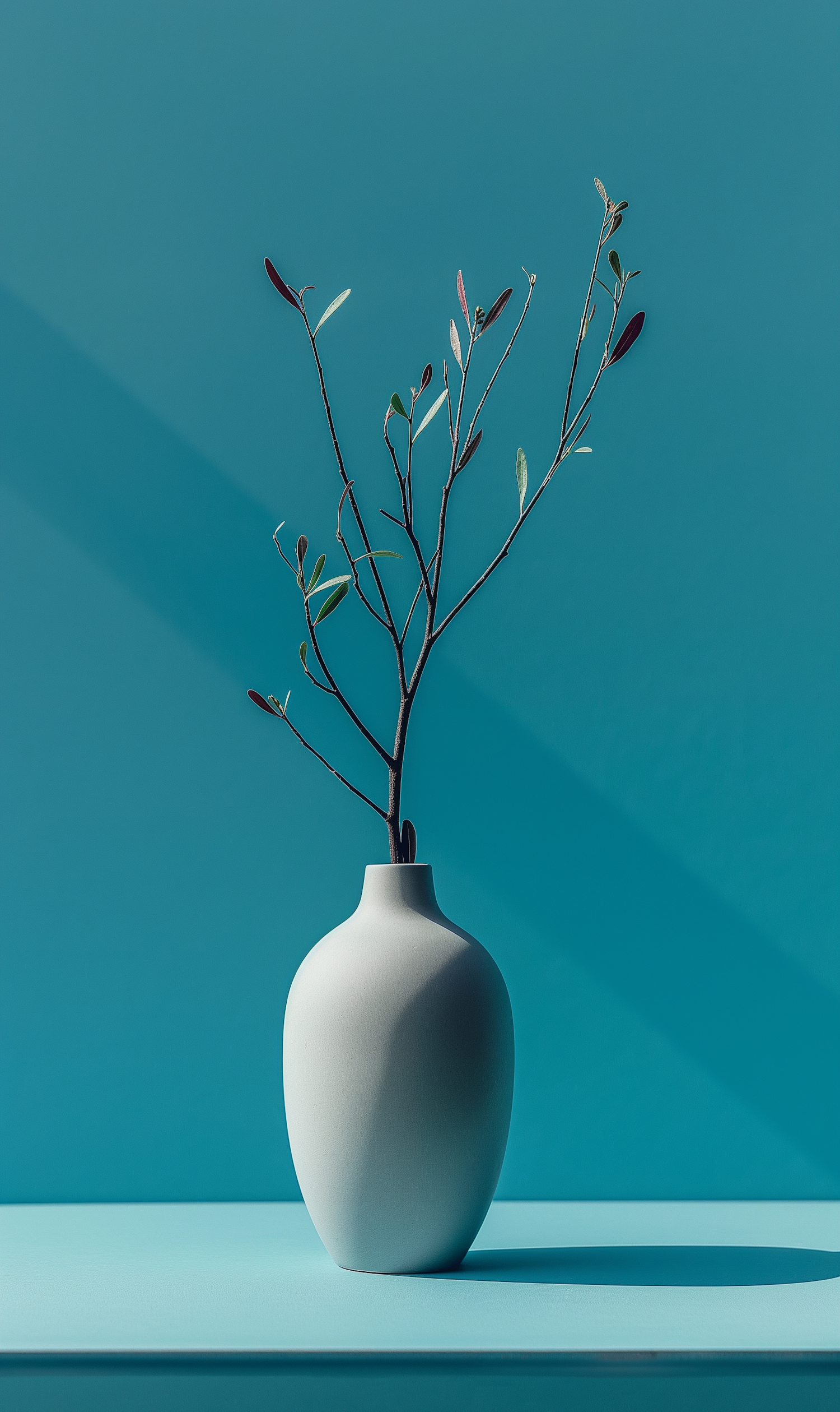 Minimalist vase with a branch against a teal background, showcasing simplicity and elegance in a modern setting.