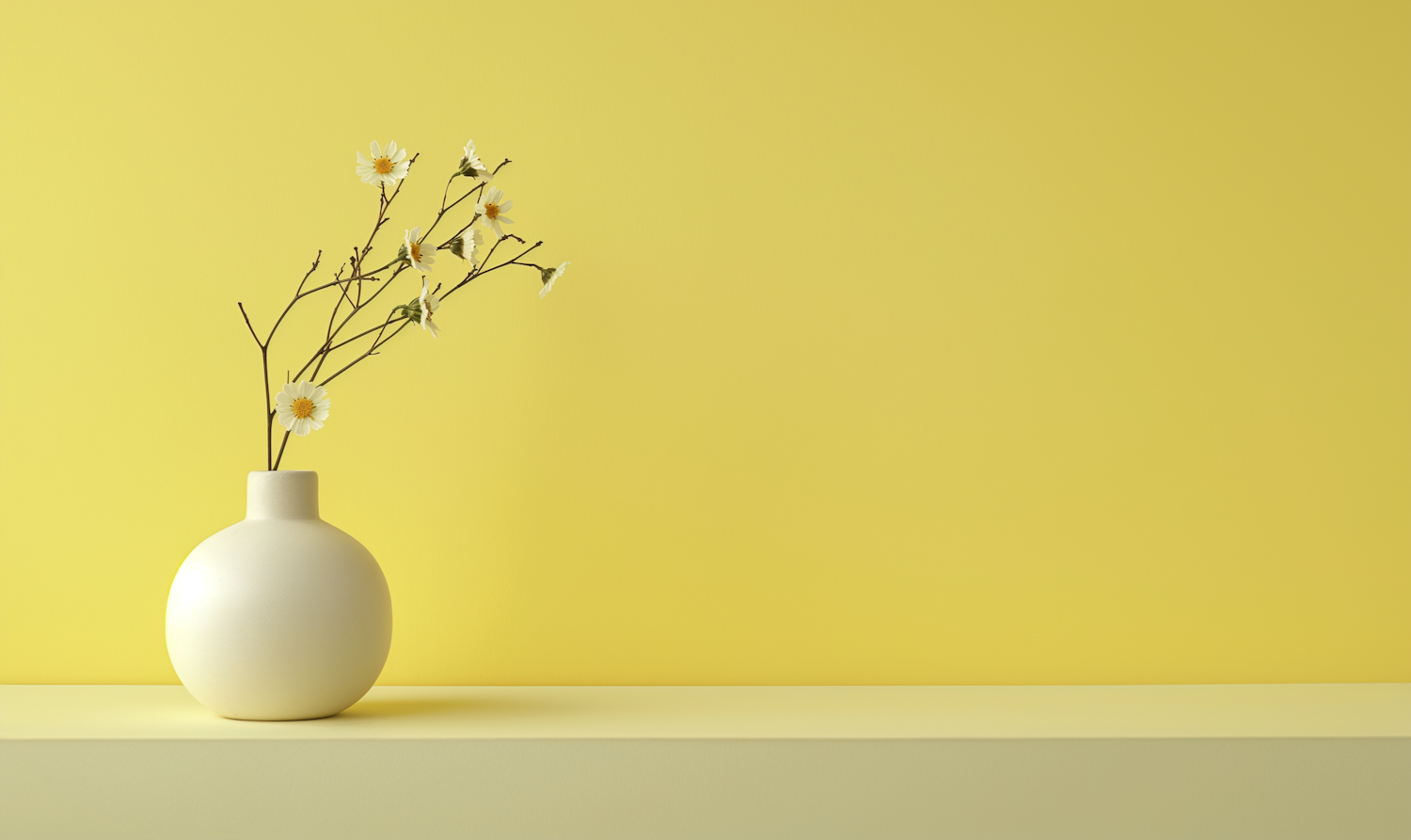 Minimalist white vase with daisies on a yellow background, creating a bright and elegant aesthetic. Perfect for modern decor inspiration.