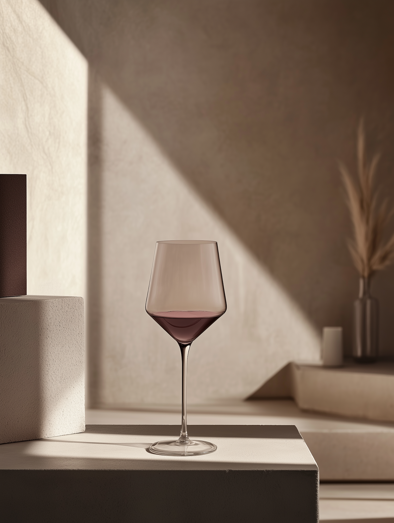 Minimalist wine glass with red wine in soft natural light, surrounded by neutral tones and geometric shadows for a modern aesthetic.