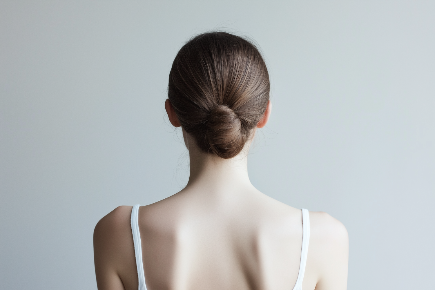 Minimalist shot of a woman with a neat bun and white top, viewed from behind against a light gray background.