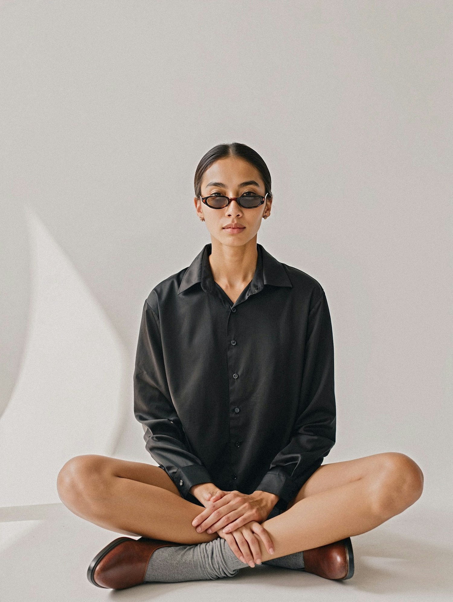 Minimalist fashion portrait of a woman in a black shirt, gray socks, and brown shoes, sitting cross-legged with small oval sunglasses.