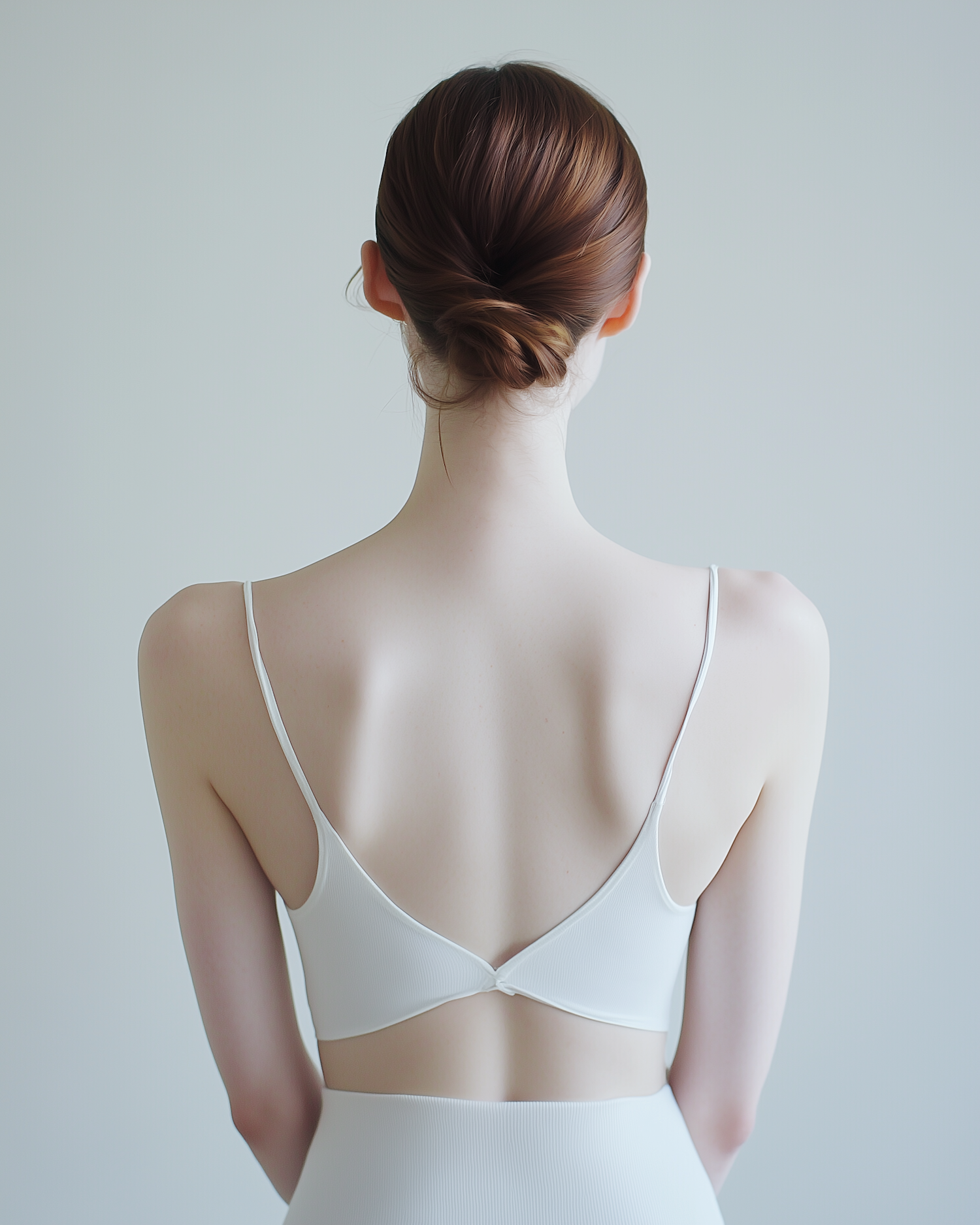 Minimalist back view of a woman with auburn hair in a bun, wearing a white bralette and high-waisted bottom against a neutral background.