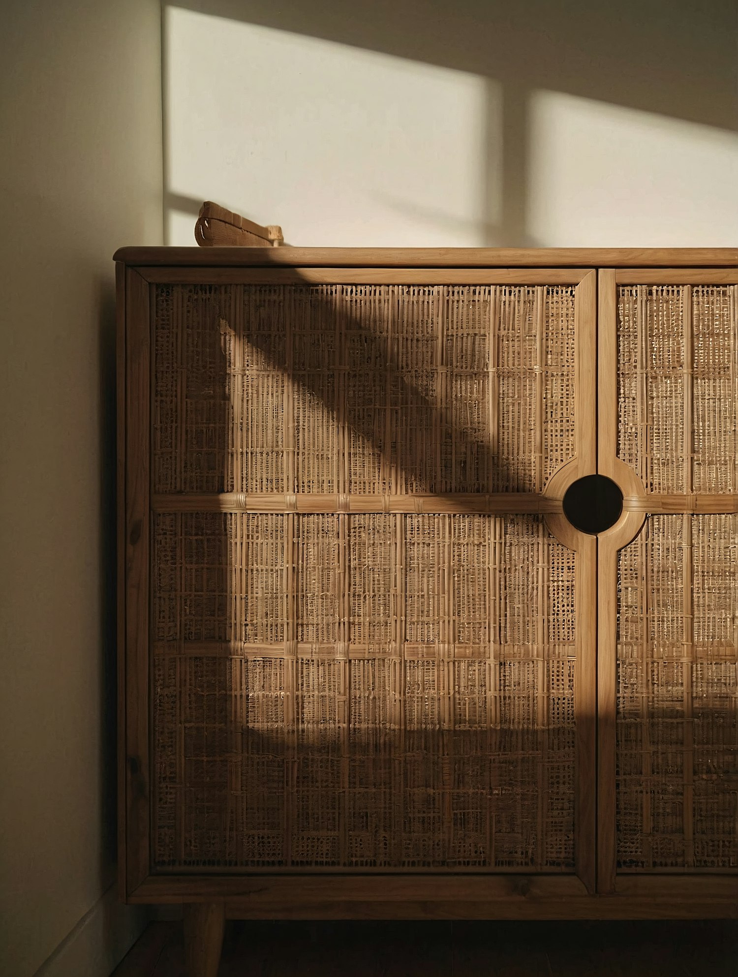 Minimalist wooden cabinet with rattan doors, circular handle, and warm sunlight casting geometric shadows for a cozy, rustic vibe.