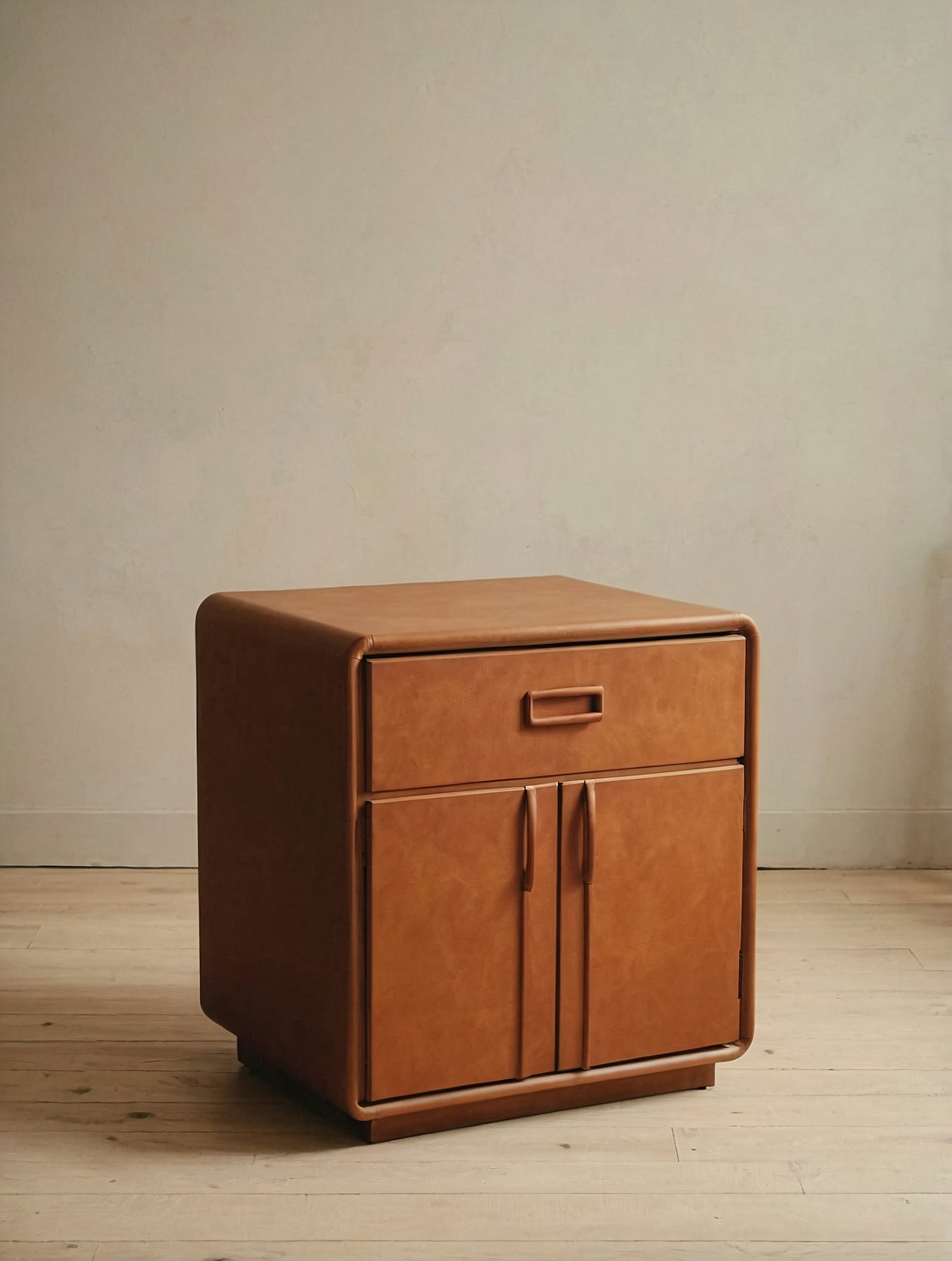 Minimalist caramel-brown wooden cabinet with rounded edges, a drawer, and two doors, set against a neutral beige wall and wooden floor.