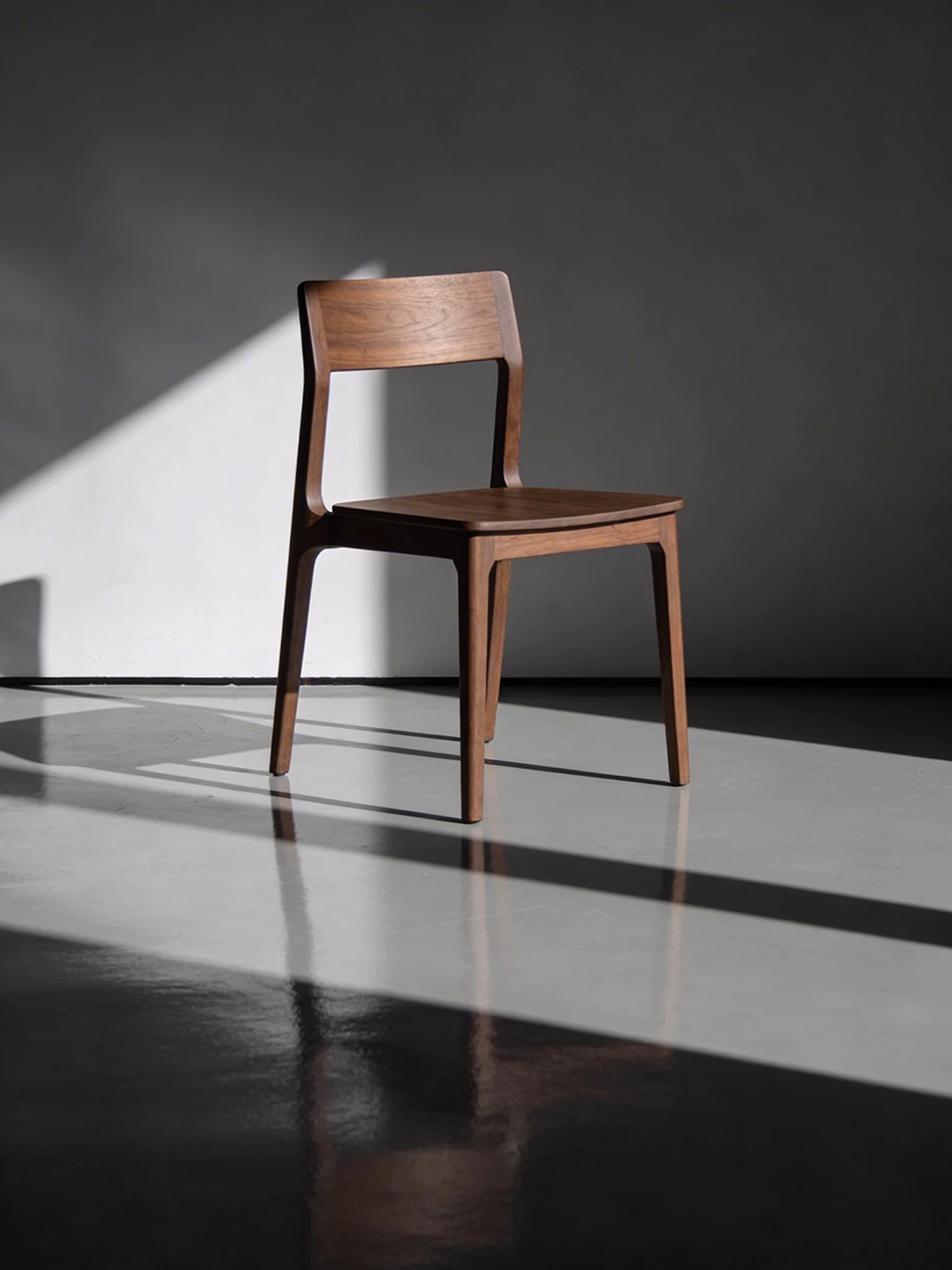 A minimalist wooden chair in a well-lit room, showcasing its natural grain and clean design with sharp shadows enhancing its elegance.