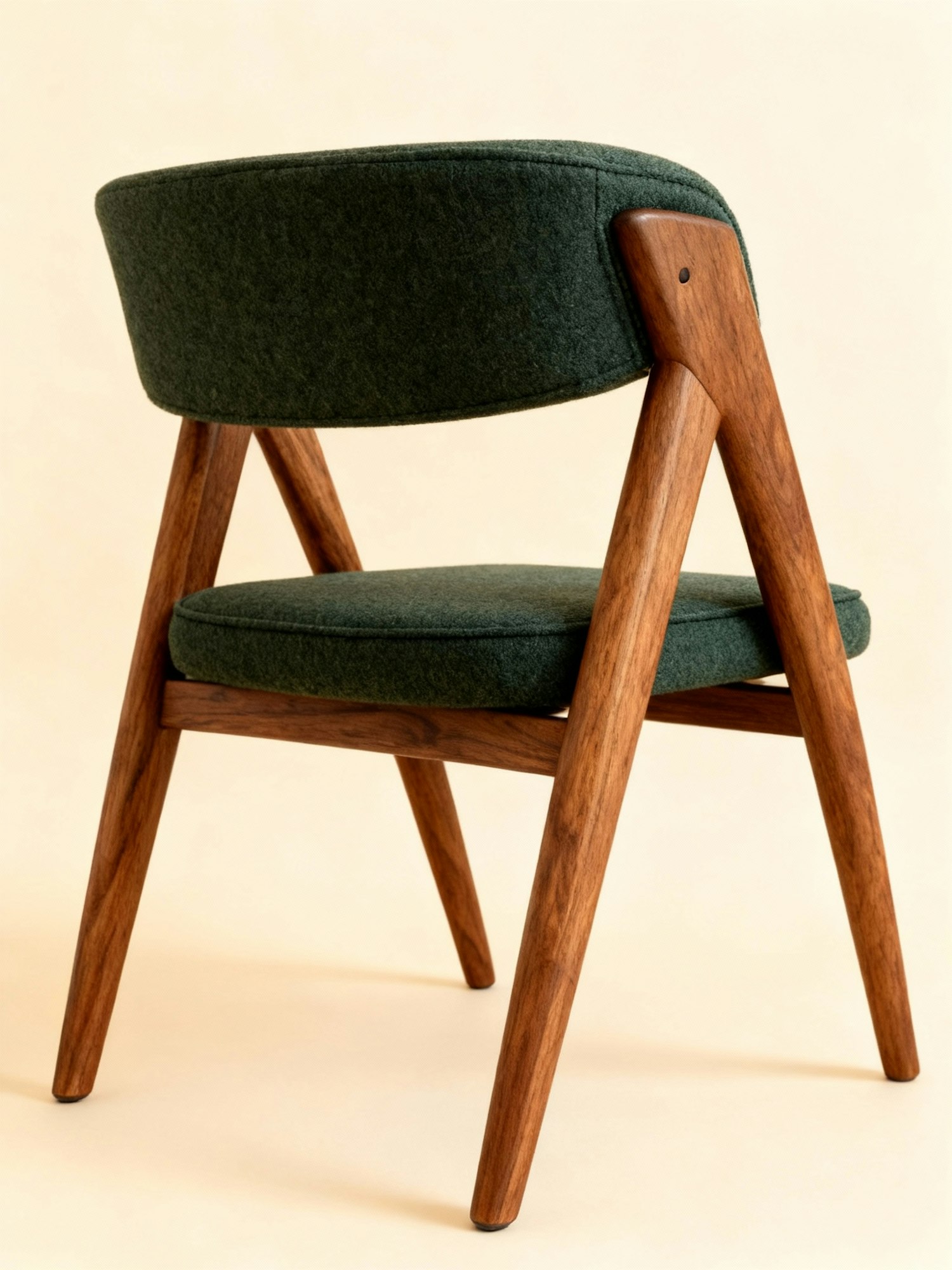 A stylish wooden chair with dark green upholstery and a minimalist design, set against a neutral beige background.