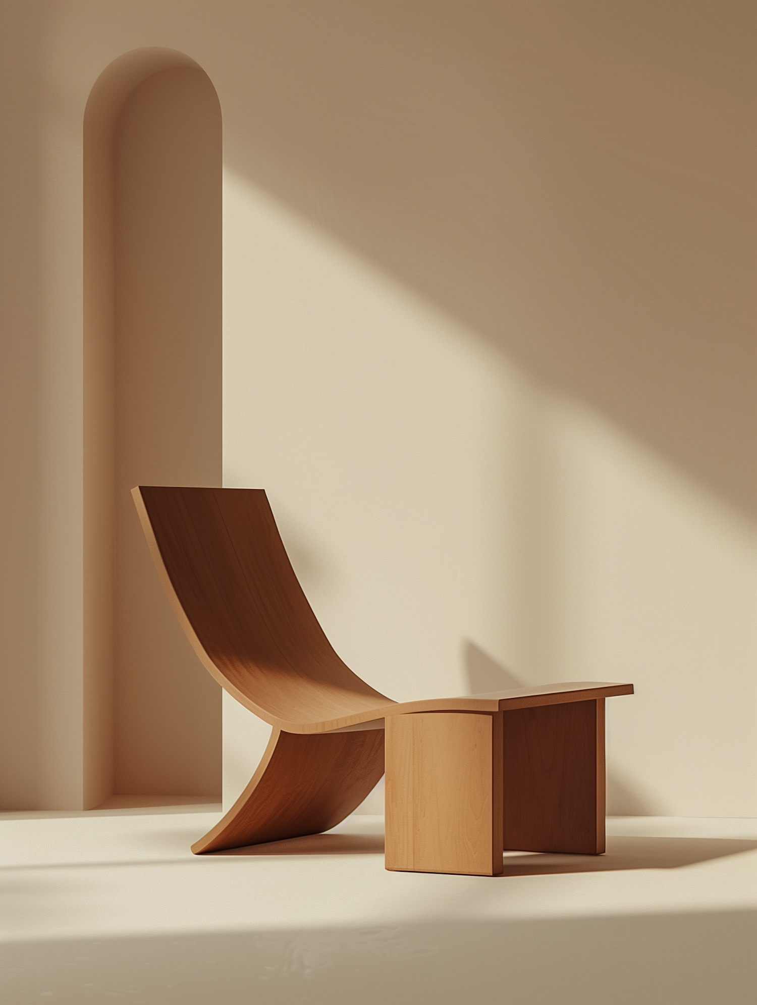 Minimalist wooden chair with a curved design in a softly lit, neutral-toned room featuring an arched wall niche and warm sunlight.