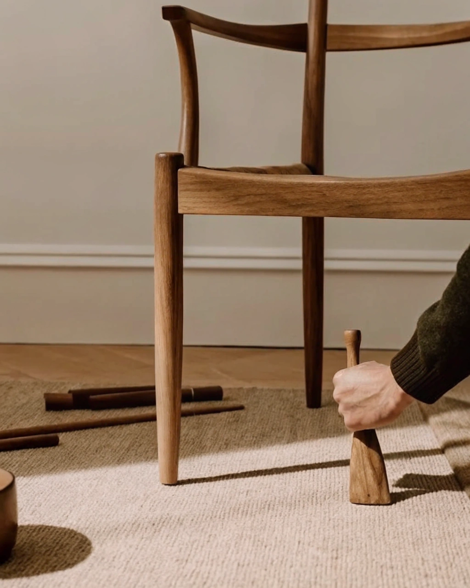 Close-up of a wooden chair being assembled with a mallet, surrounded by tools on a beige rug in warm natural lighting.