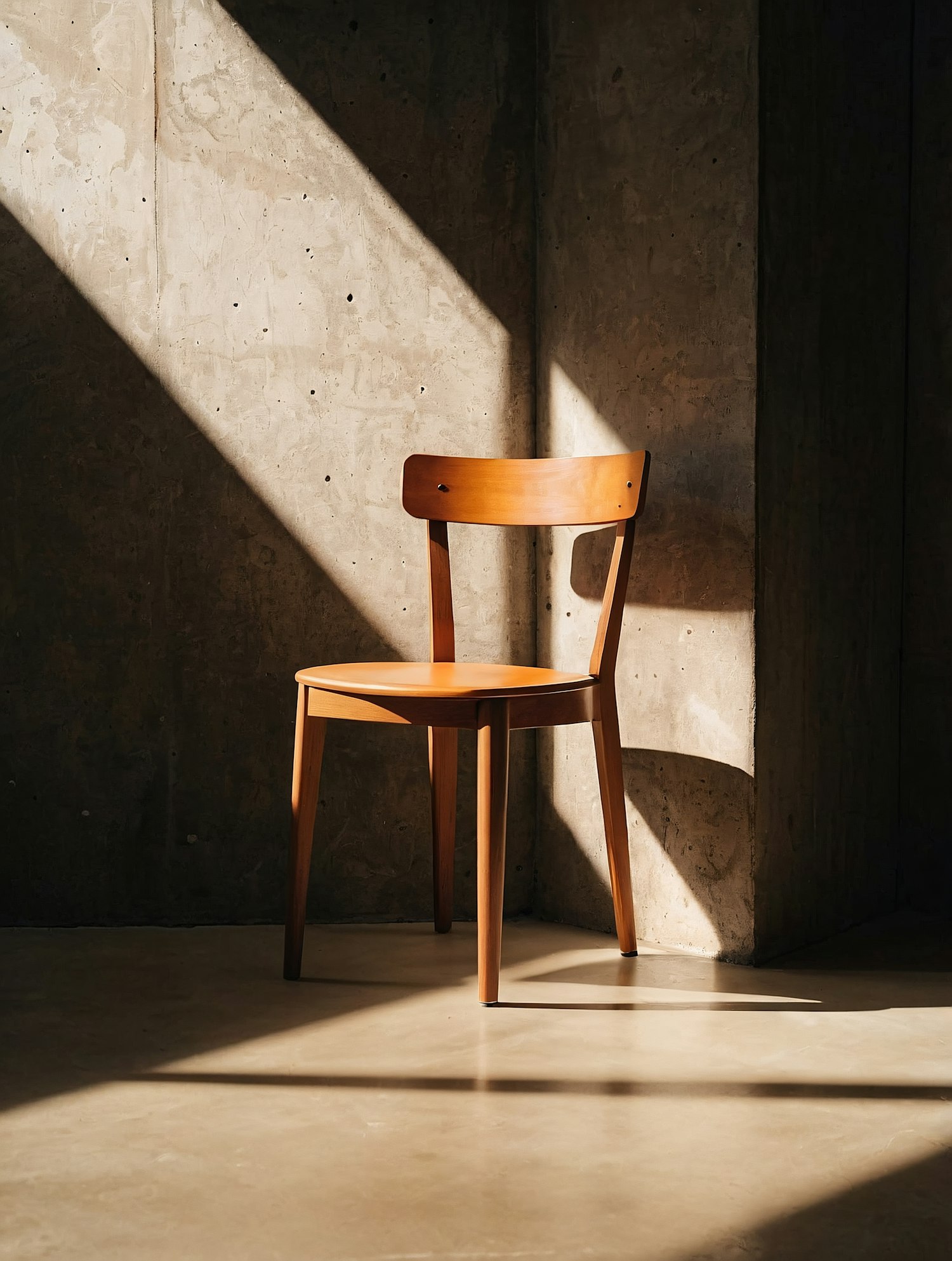 A minimalist wooden chair bathed in sunlight, set against raw concrete walls with dramatic shadows on a polished floor.