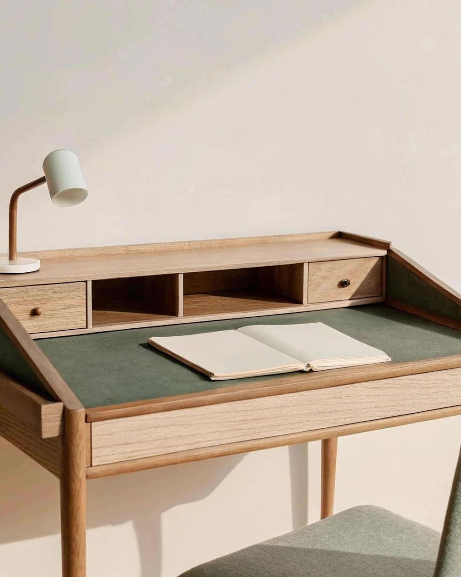 Minimalist wooden desk with green felt surface, storage drawers, a modern lamp, and a matching green chair in a serene setting.