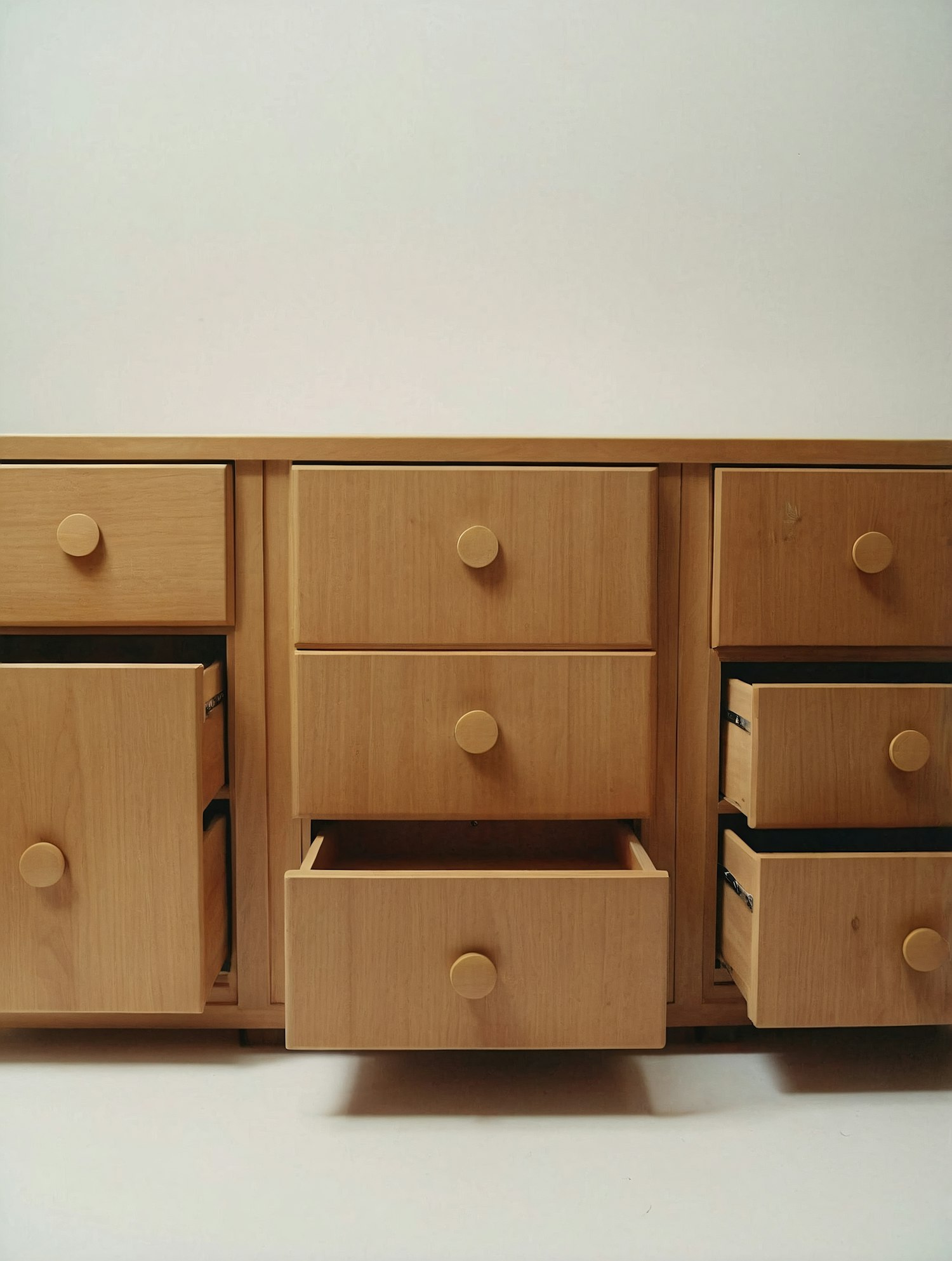 Minimalist wooden dresser with six drawers, natural finish, and round knobs. Some drawers are open, showcasing its functional design.