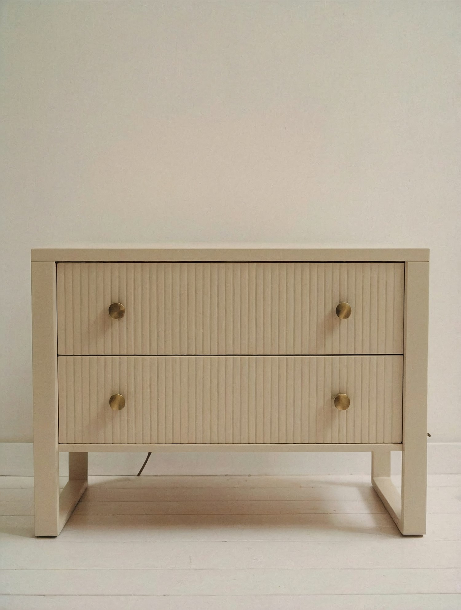 Minimalist beige wooden dresser with ribbed drawers and brass knobs, perfect for modern interiors. Clean lines and neutral tones.