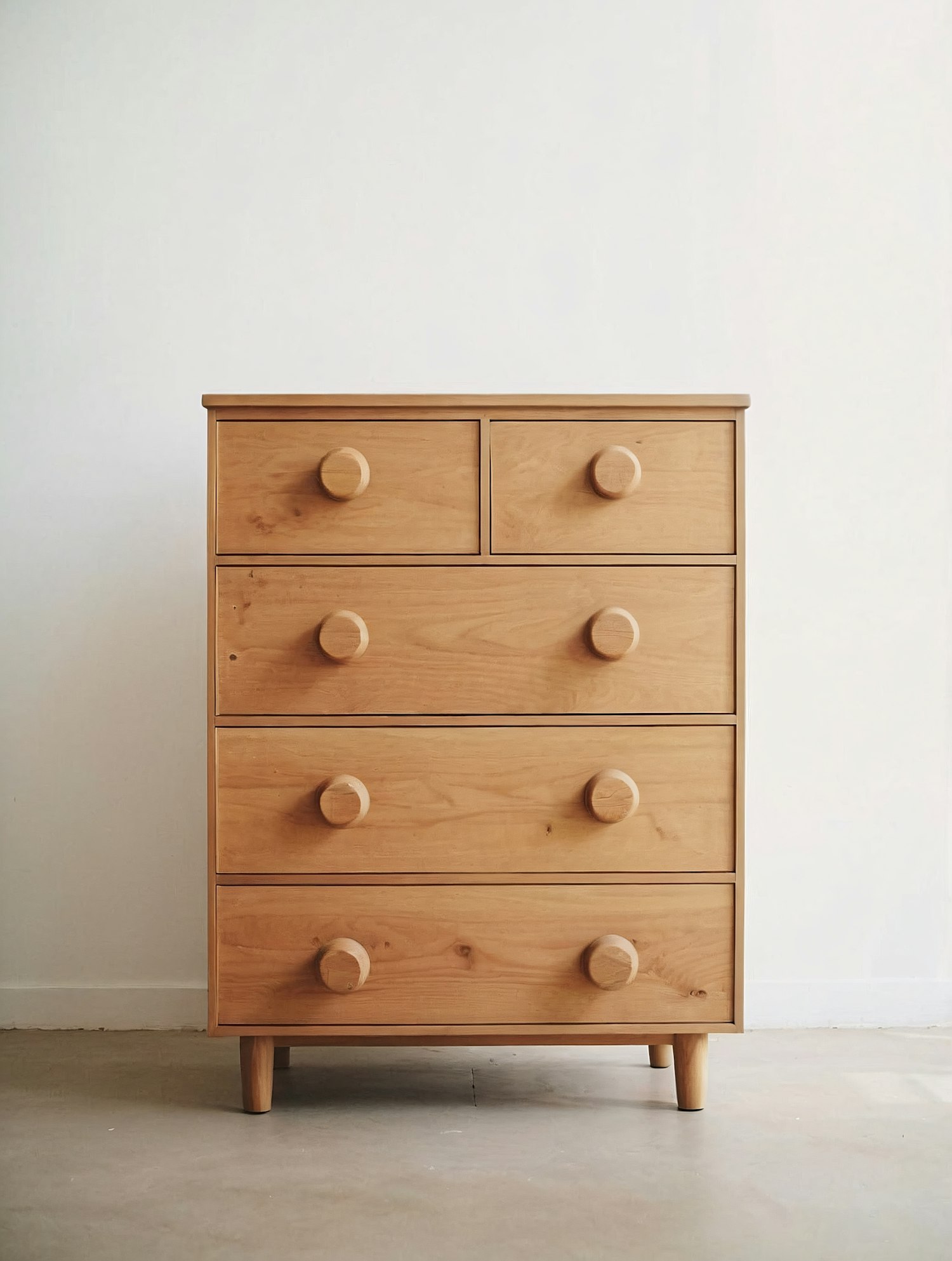 Minimalist wooden dresser with five drawers, round knobs, and tapered legs, perfect for a modern or mid-century style interior.