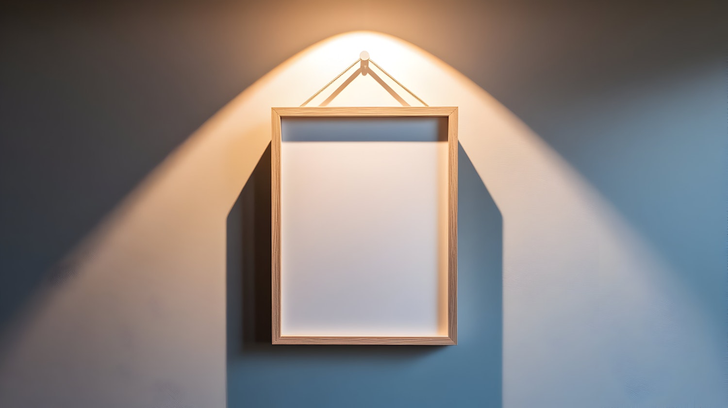 Minimalist wooden frame on a blue-gray wall, illuminated by warm light, creating soft shadows. Perfect for modern decor inspiration.