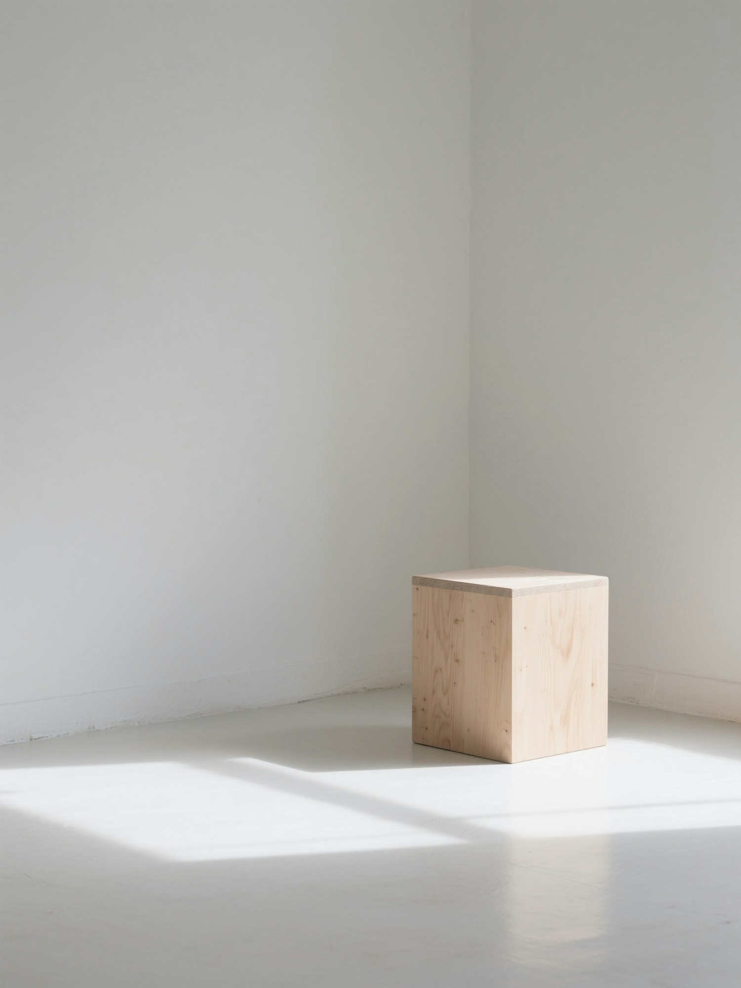 Minimalist wooden cube stool in a bright white room with sunlight casting soft shadows, creating a serene and clean aesthetic.