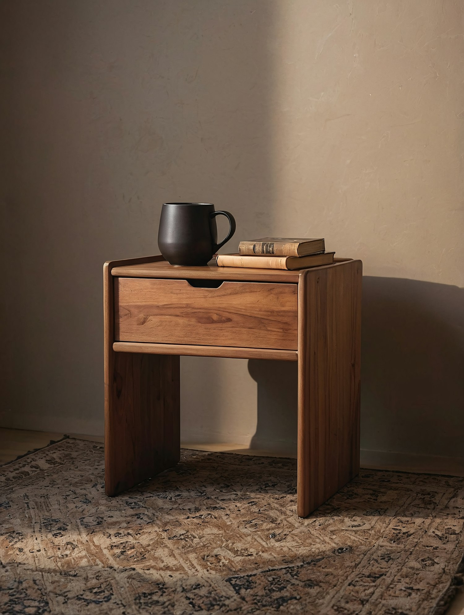 Minimalist wooden side table with a drawer, black mug, and vintage books on a patterned rug in soft natural light.