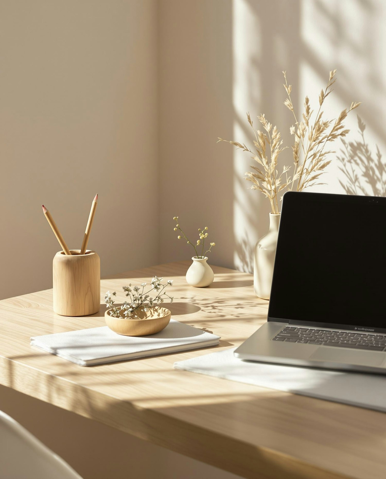 A sunlit wooden desk in a soft, warm atmosphere. On the desk: a natural wood pencil holder with two sharpened pencils, a small ceramic dish with dried flowers, a closed silver laptop, a linen-covered notebook, and a small beige ceramic vase with delicate dried grasses. The background wall is smooth and bathed in natural daylight with soft shadows. The overall style is minimalist, calm, refined, and inspired by Scandinavian and branding studios. Studio lighting, no harsh contrast, no clutter, neutral tones, high realism, photo taken in a real-life setting.