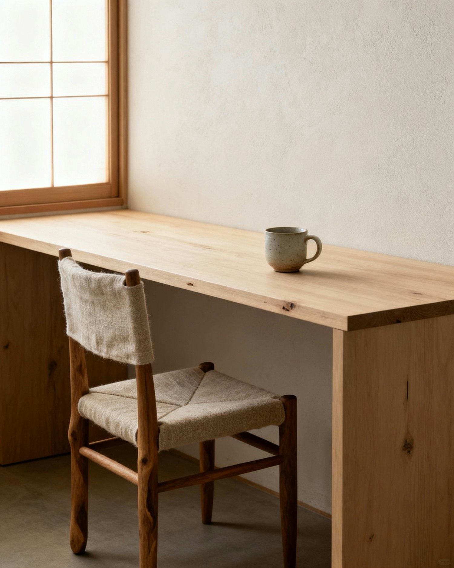 Minimal japanese interior design, wabi-sabi and japandi atmosphere, soft natural daylight, calm and quiet mood, realistic photography, subtle depth of field, balanced composition, minimal styling, handcrafted furniture, natural imperfections, organic forms, slow living aesthetic, editorial interior photography style A minimalist japanese workspace with a low wooden desk in pale wood, a floor chair in linen and wood, a handmade ceramic mug, smooth plaster wall, rice paper window diffusing the daylight